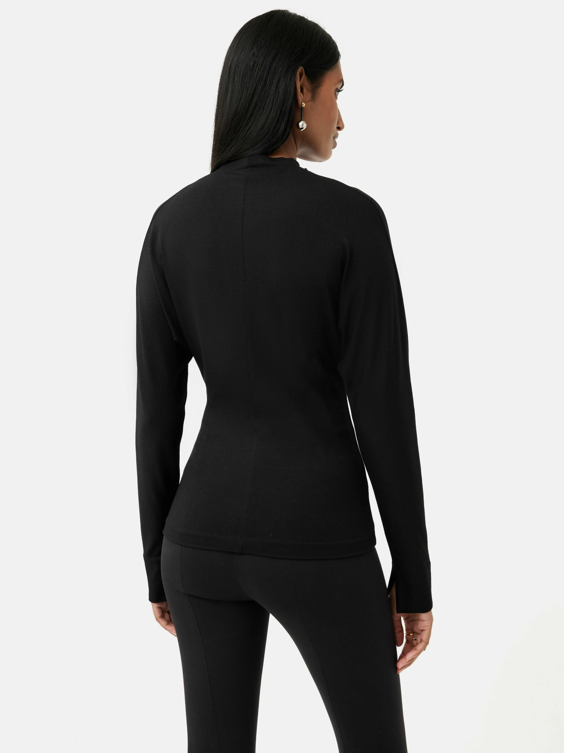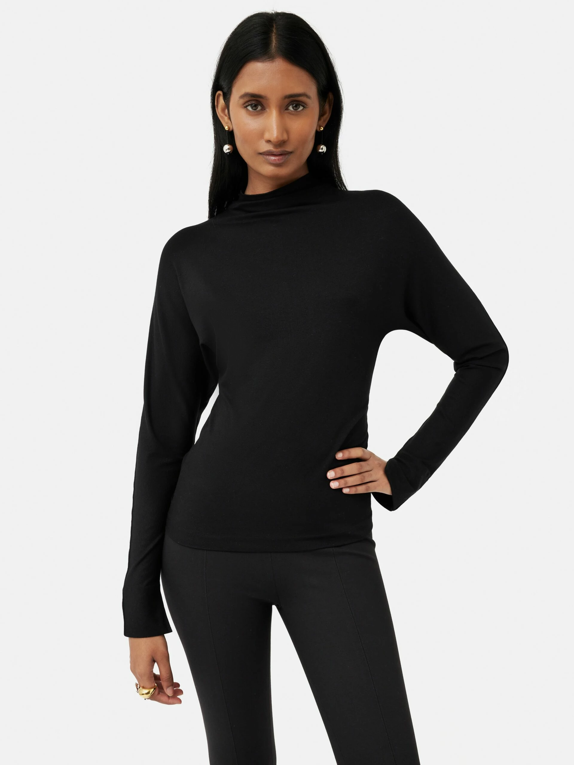 Patterned in house for the perfect fit and made in Europe, a jersey layer with a draped cowl neckline. Features a batwing sleeve that is deep through the armhole and tighter at the cuffs, with slits to let you fold them back. Slim fitting through the body, layer under jackets or tuck it into high-waisted trousers.