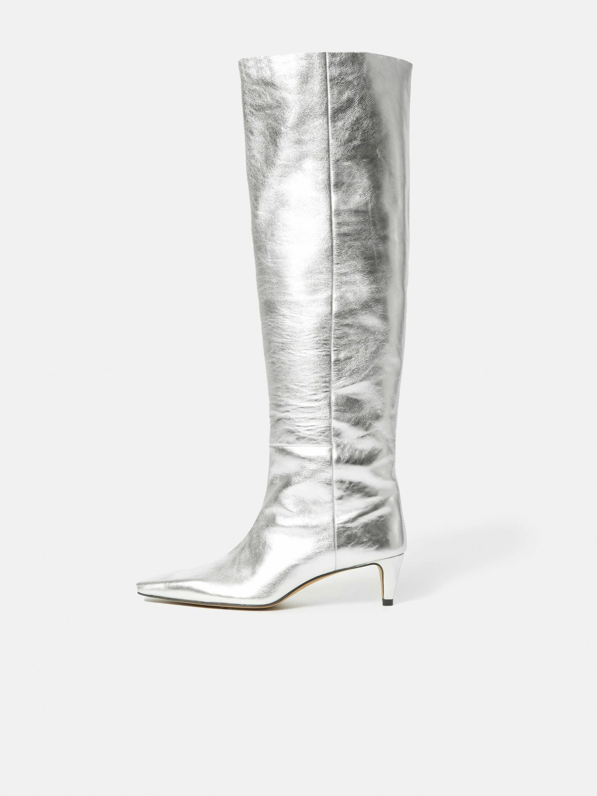 This seasons statement boot is knee high with a chiselled toe. Featuring a padded in sock, leather lining and a 55mm kitten heel making it comfortable enough to wear all day. Launching in premium silver foil leather, this boot looks great with both dresses and skirts.