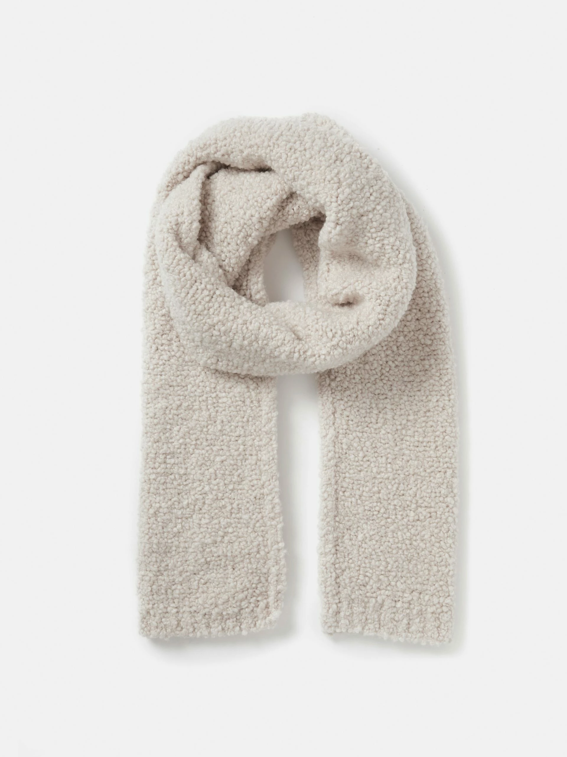 A super sumptuous scarf crafted from cream boucle extrafine merino wool. Boucle means yarn with a looped ply. Keep your neck cosy all season with this perfect winter accessory. Pair with the matching mittens and beanie to complete the look.