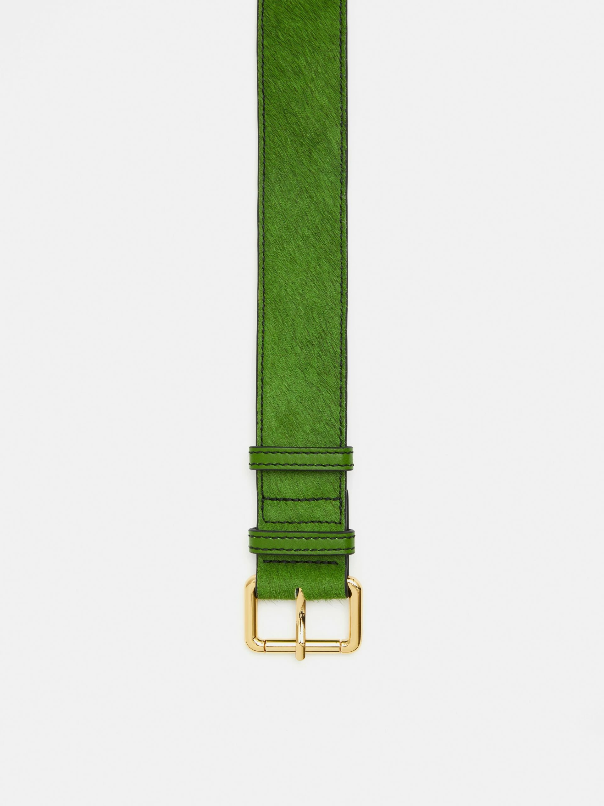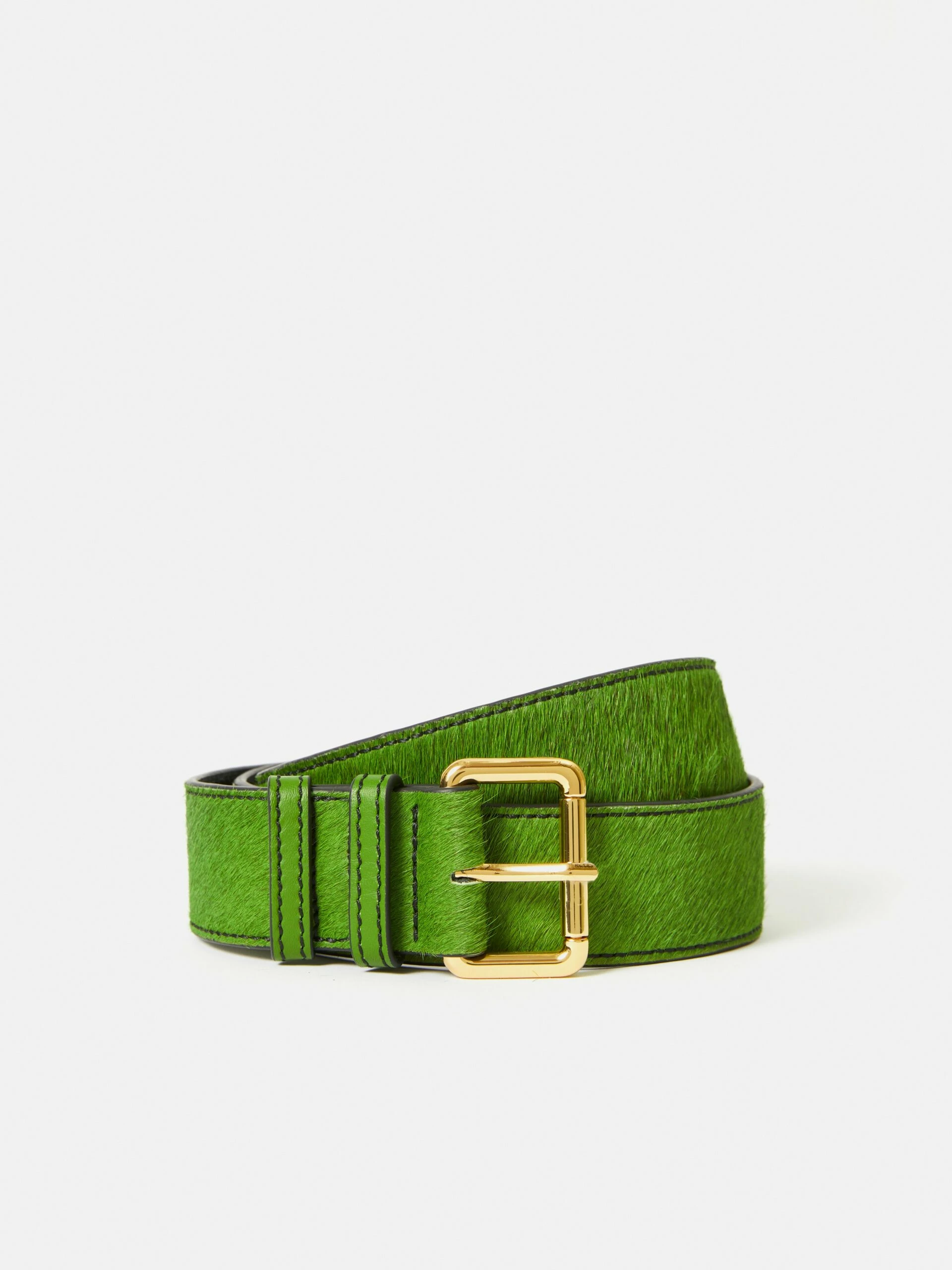 Our statement calf hair belt is back in bright green to add a pop of colour to your outfit. With painted edged and leather underside, featuring a roller buckle and double belt loops.