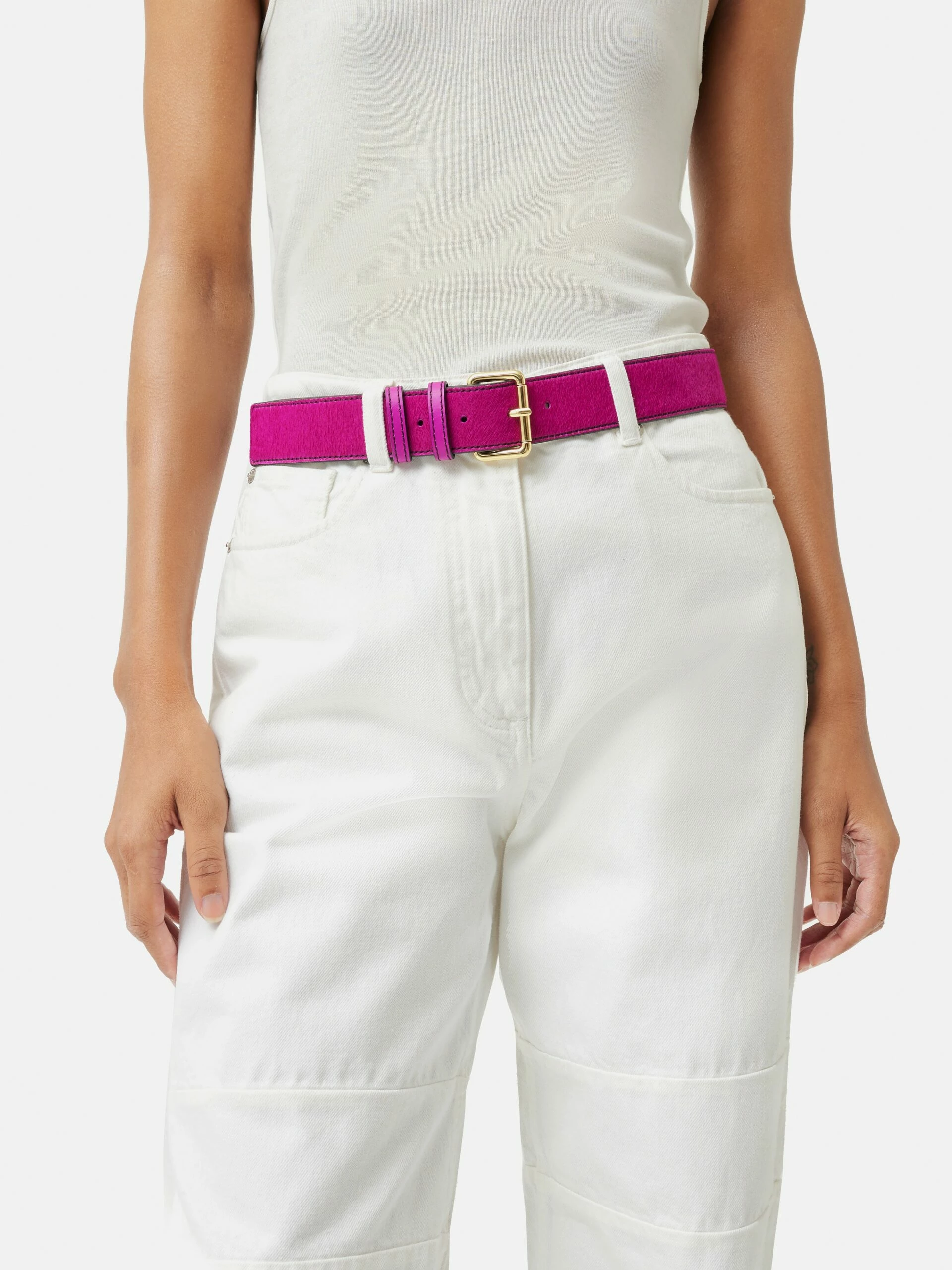 Our statement calf hair belt arrives in vibrant pink to add an of the moment pop of colour to your look. With painted edged and leather underside, featuring a roller buckle and double belt loops.
