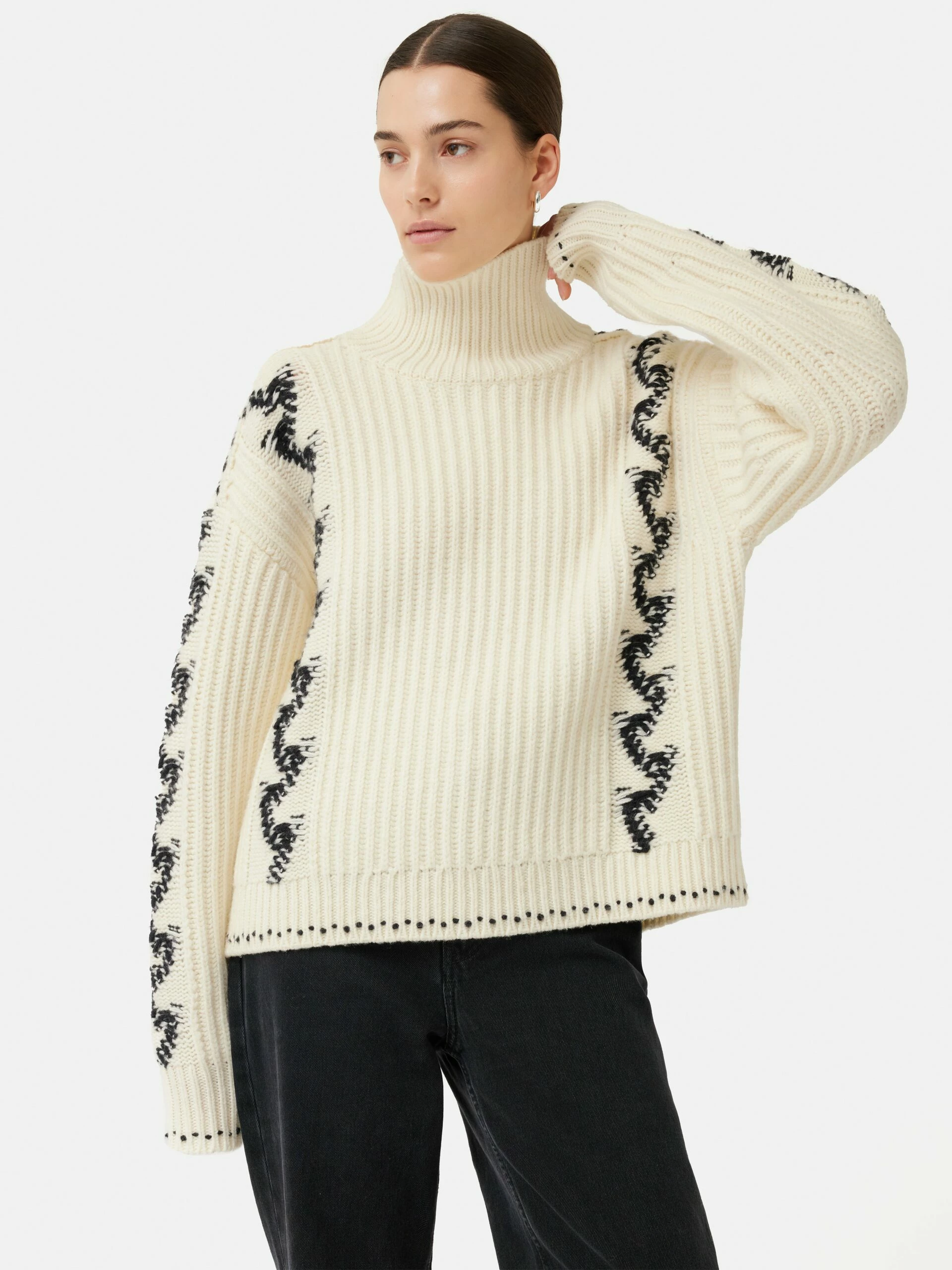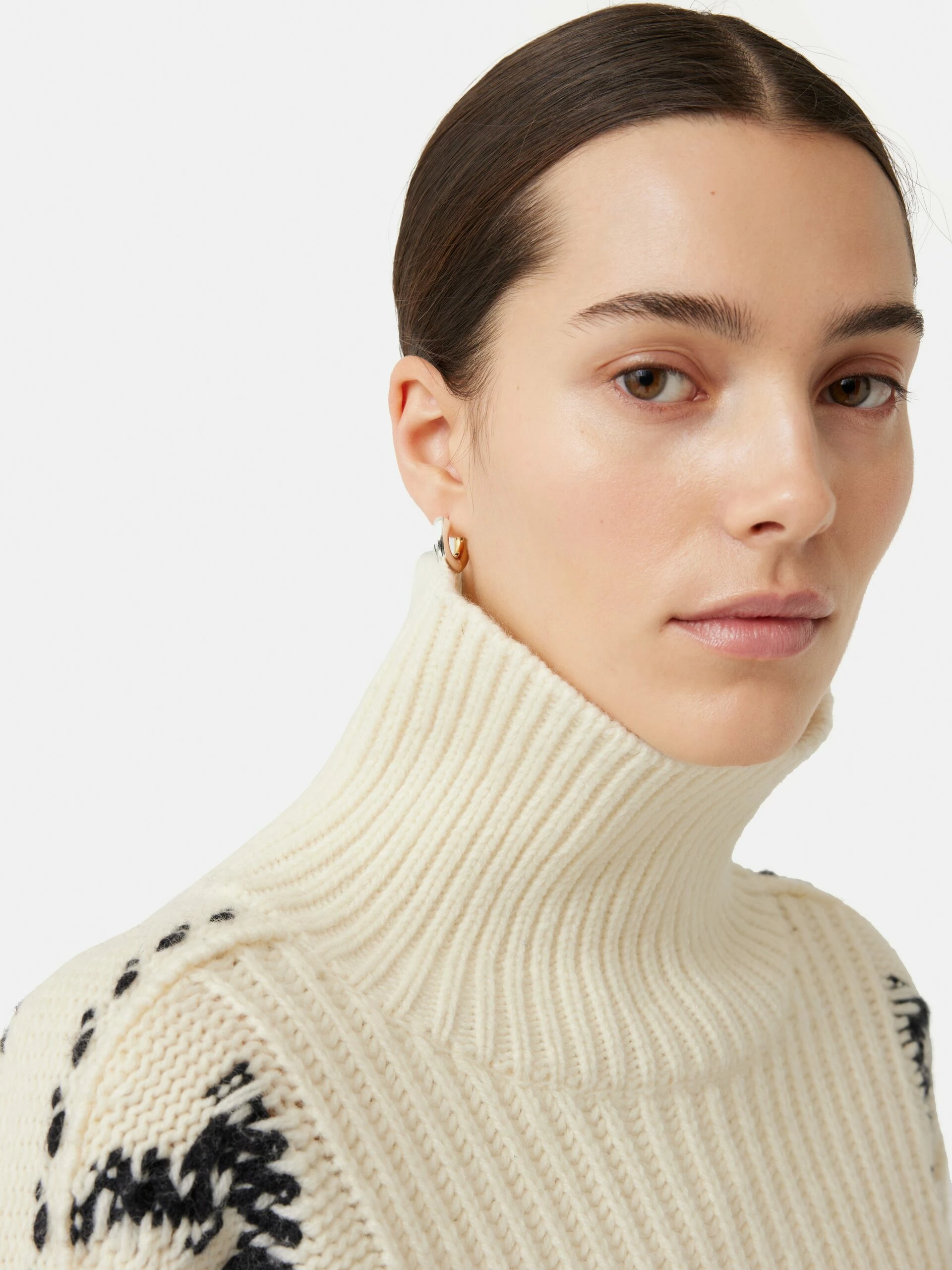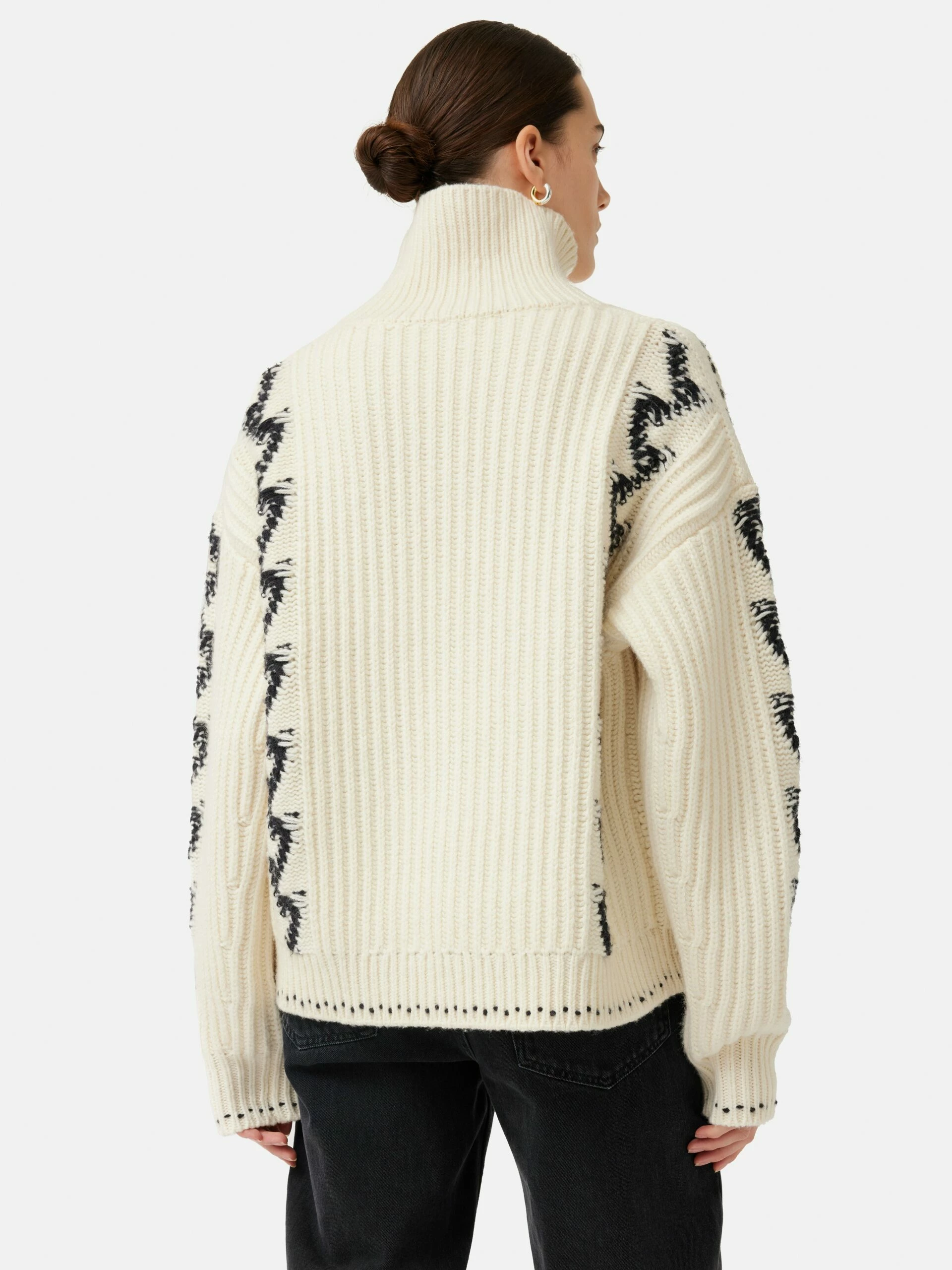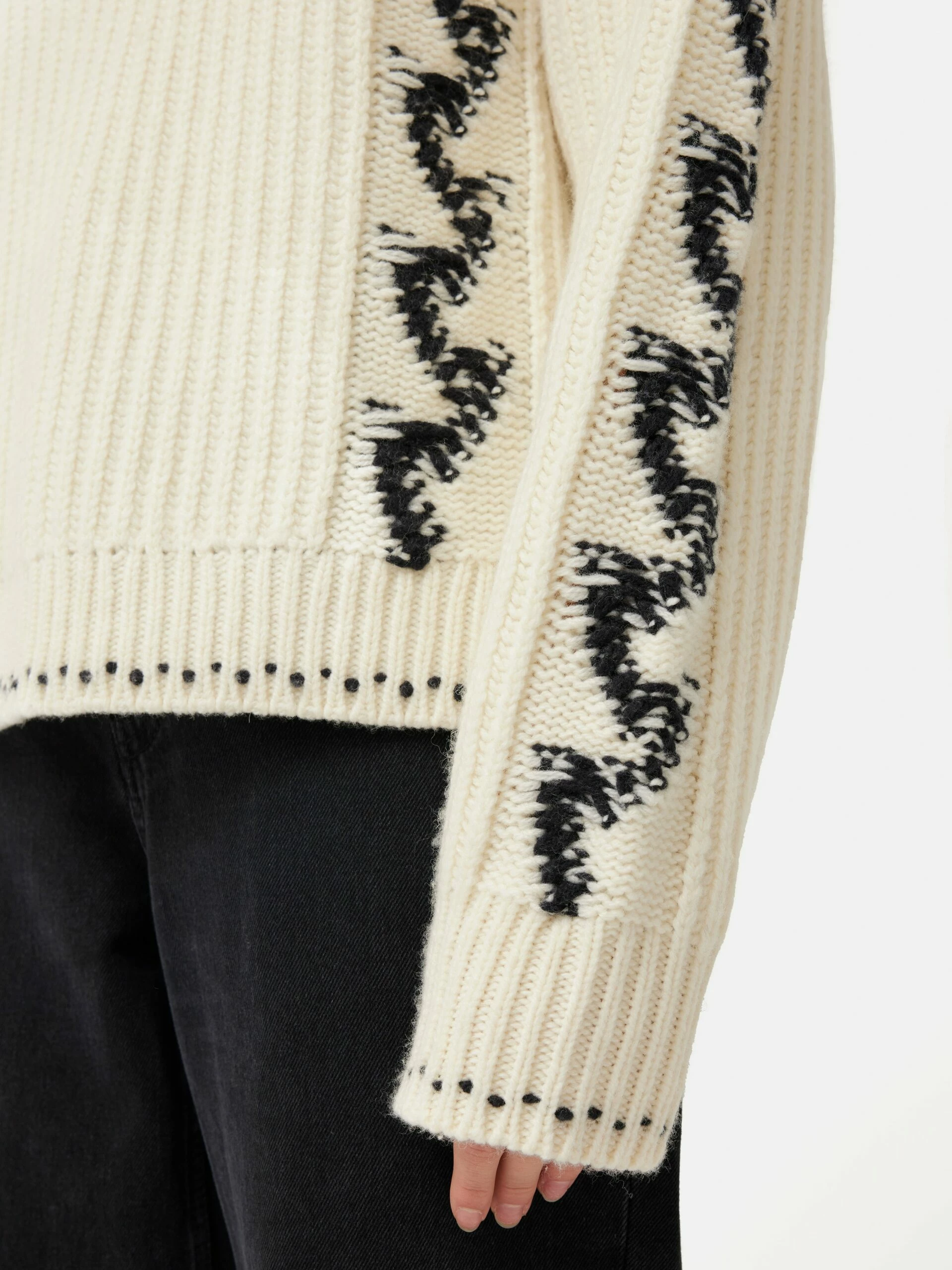 Designed for the mountains ? and every other landscape, this jumper embodies elevated alpine elegance. Revel in the crisp allure of monochrome hues, enlivened by intricate jacquard patterns and meticulous hand-stitching details. The generous turtleneck not only exudes style but ensures unparalleled warmth, embracing both fashion and function for your winter adventures.