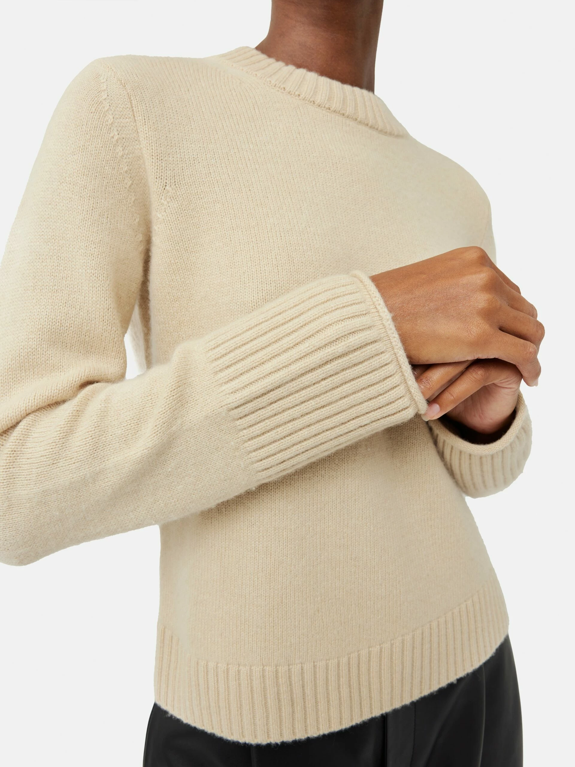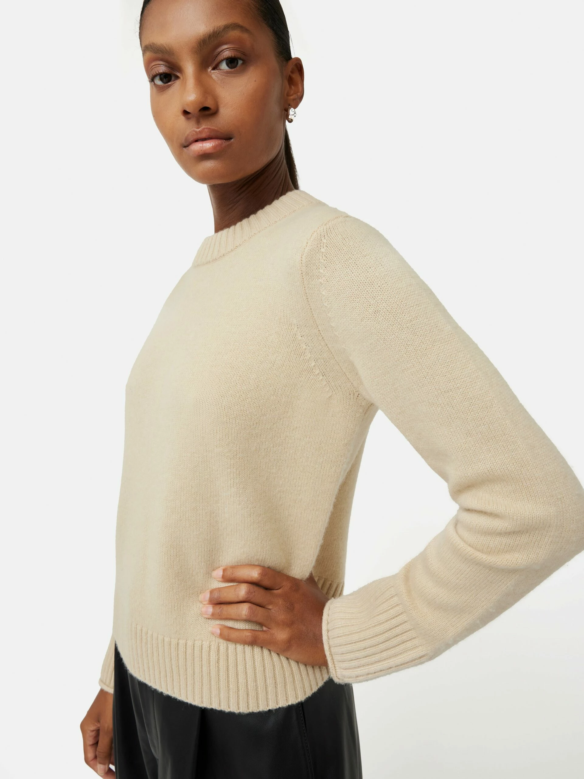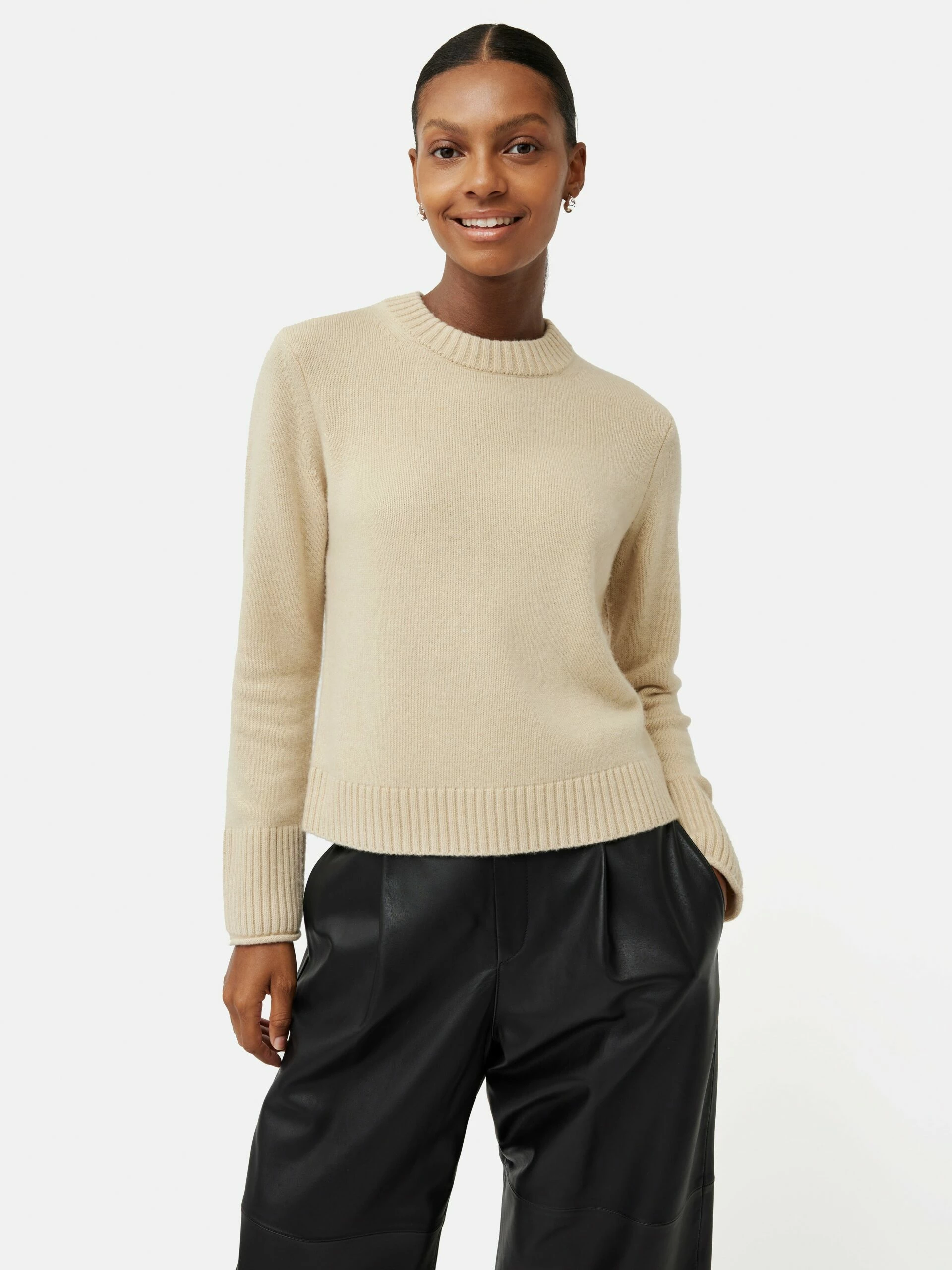 Knitted in a mid weight wool cashmere blended yarn, our crew neck jumper is designed with a shorter silhouette. Finished with modern chunky rib at neck and cuffs. Pair with denim and leather separates or layer over printed dresses. Size up for a more slouchy look.