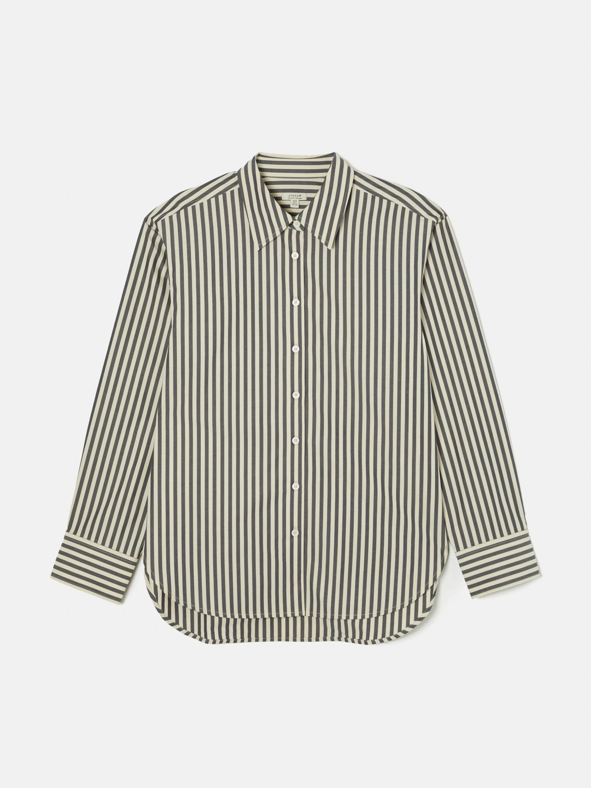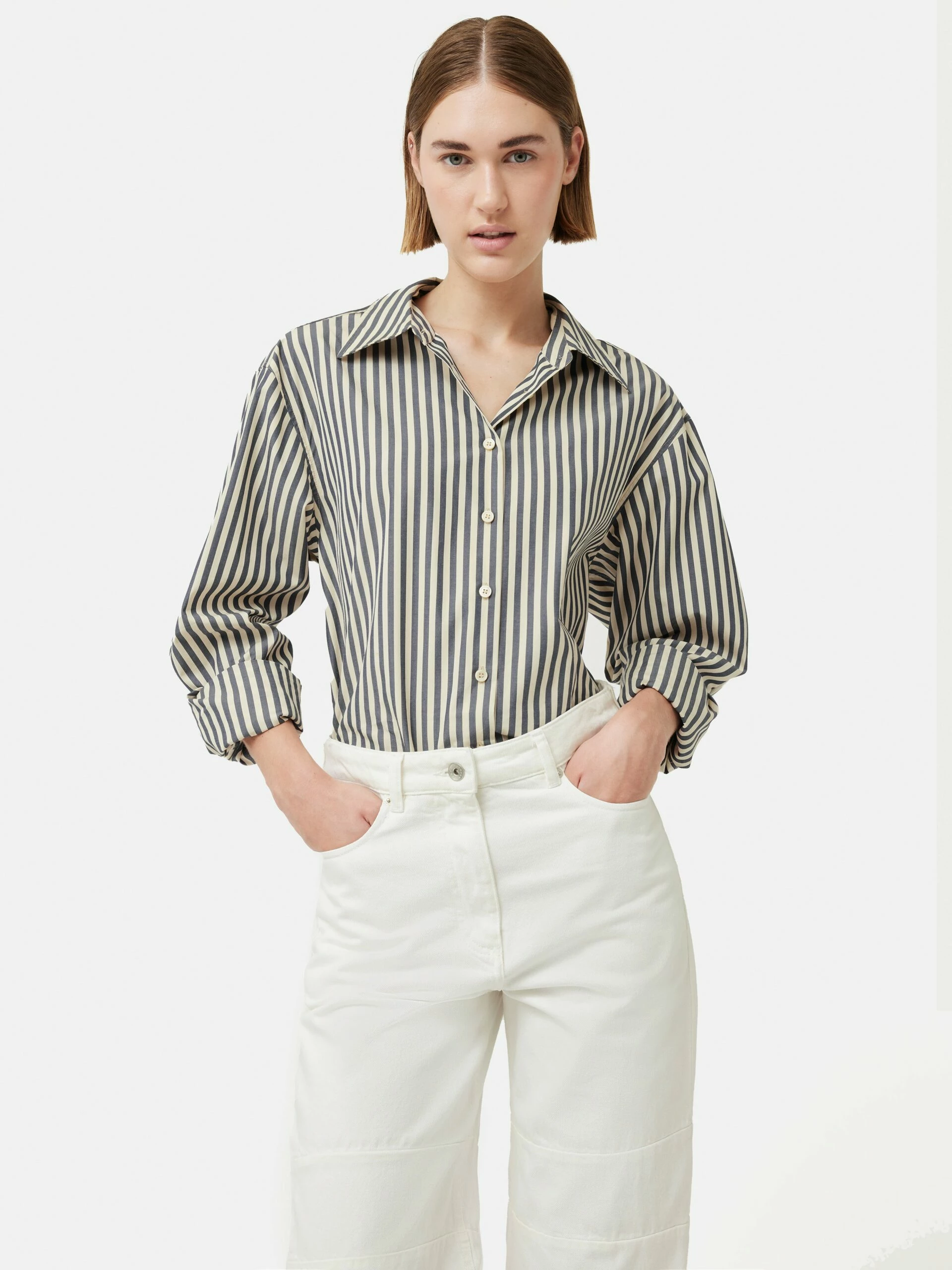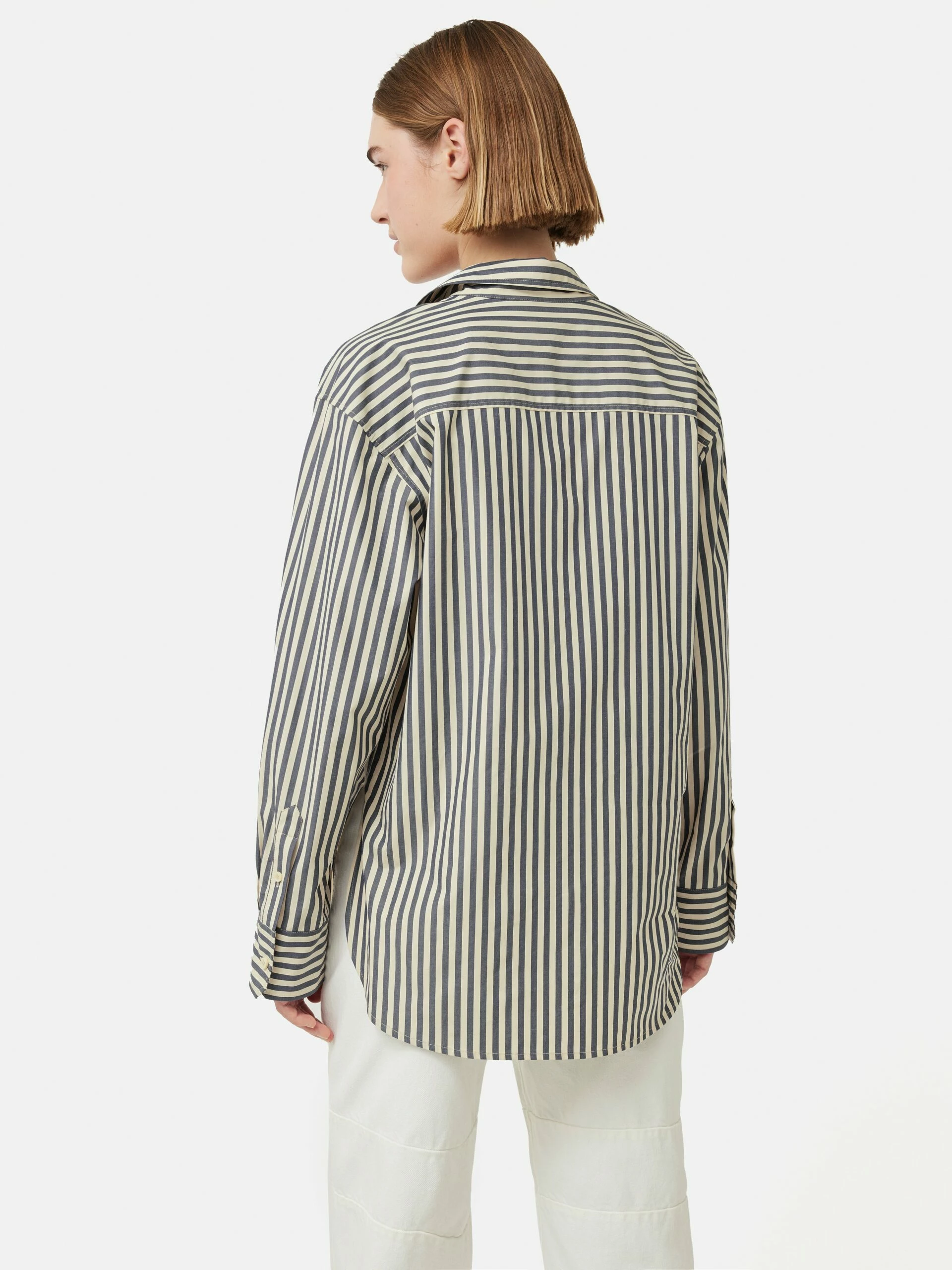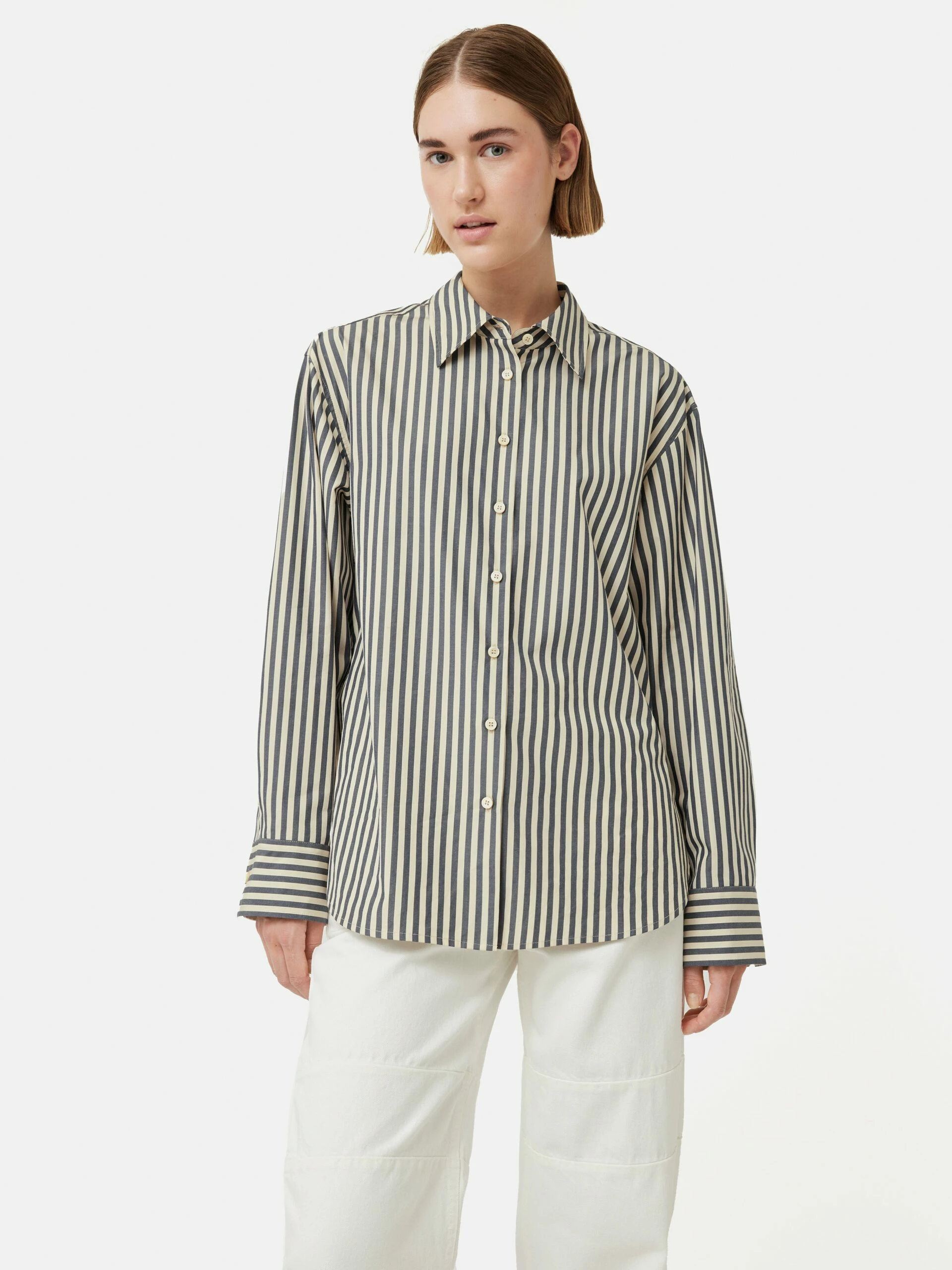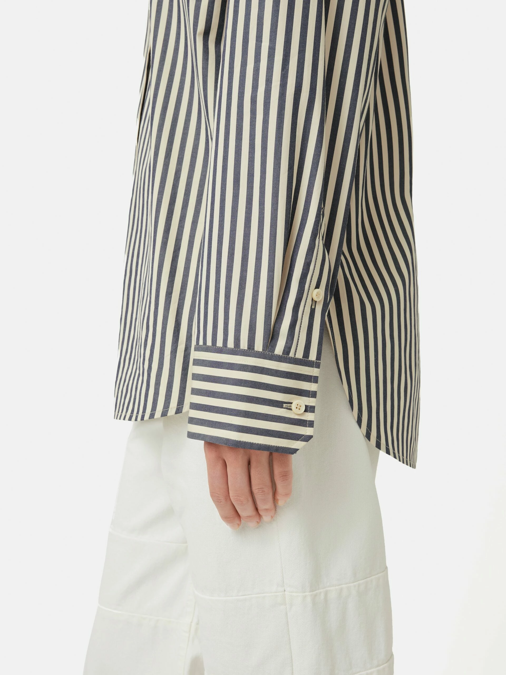 Vintage cream and navy striped soft cotton-poplin shirt. Features evocative of classic mens tailoring including side slits, a box pleat and scooped shape hem. Elevated by mother of pearl buttons and top stitch details. The oversized fit allows for an adaptable silhouette, can be worn tucked in or untucked with sleeves rolled up or down. Pair with denim seperates or new season tailoring for an autumnal reset.
