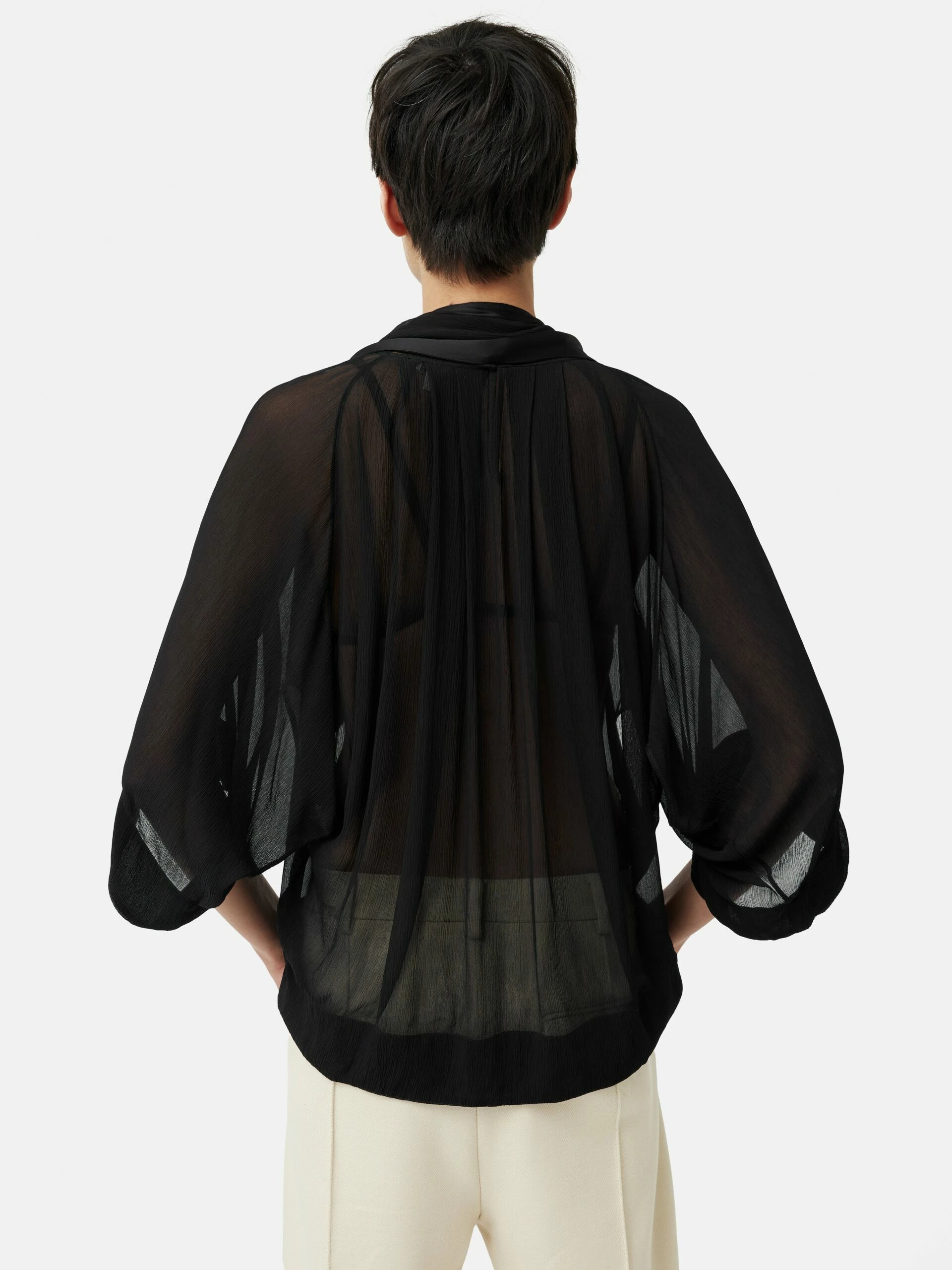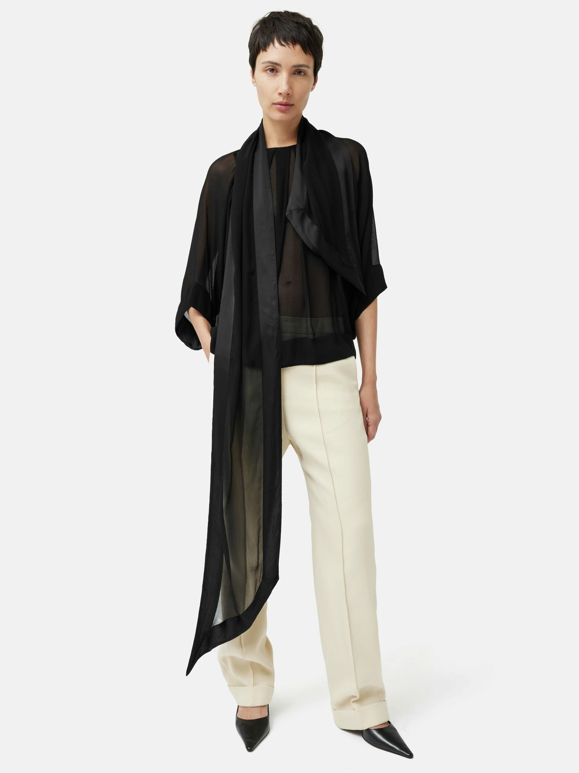 The ultimate multi-tasker. This top with a built-in scarf saves you the hassle of accessorising separately. Semi-sheer so designed to be worn atop a vest, this piece is ideal for parties when paired with tailored attire or bold leather pants.