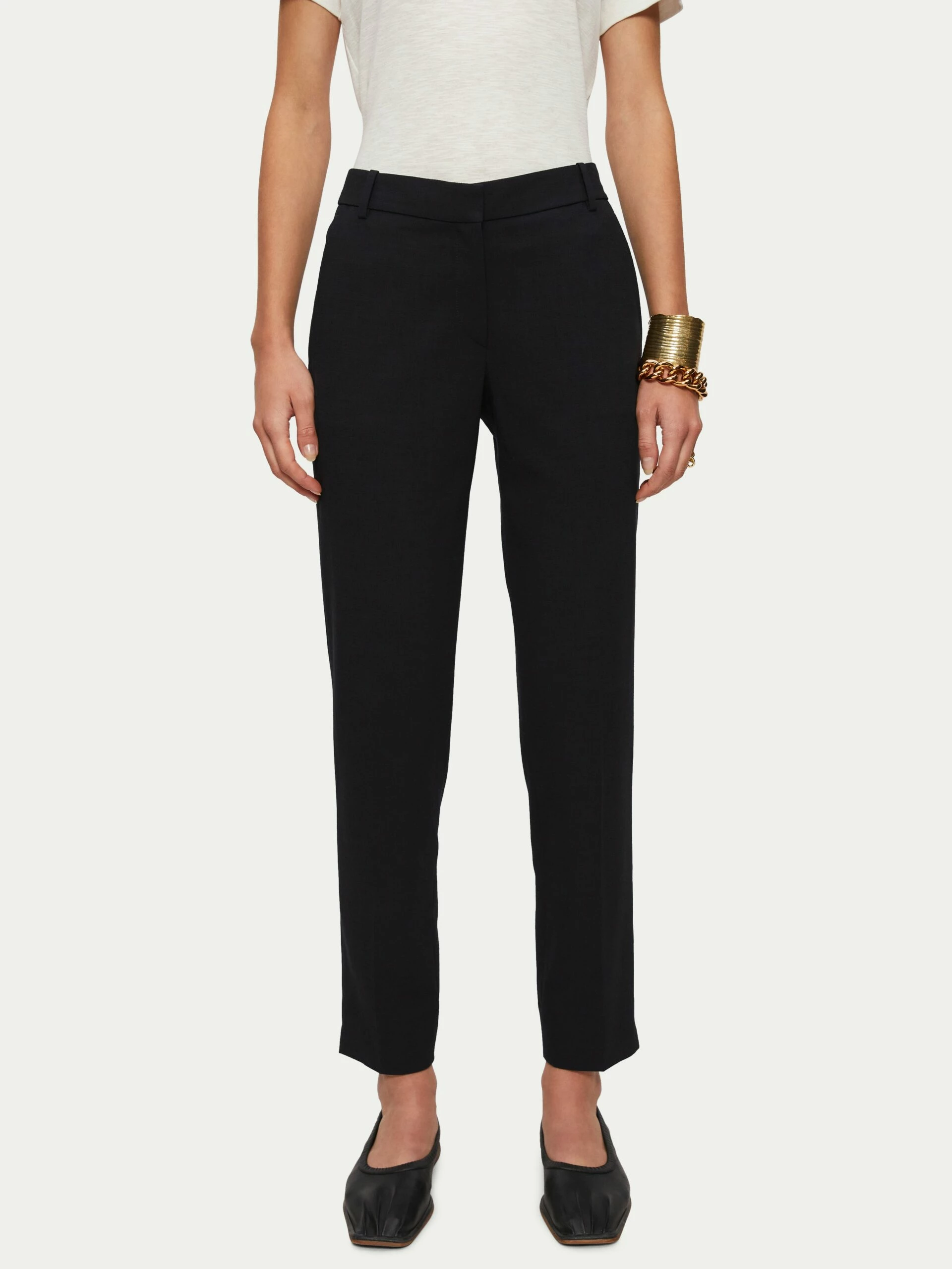 The tapered leg trouser is the next chapter in our bestselling crosshatch weave edit. Tailored with a textured, sustainable viscose-blend from Portuguese heritage mill, Riopele. A sleek silhouette animated by shallow slits at trouser hem sides and the waistband centre. Features front slant pockets and back jetted pockets. Complete the set with our Crosshatch Knox Blazer for a functional and flattering look.