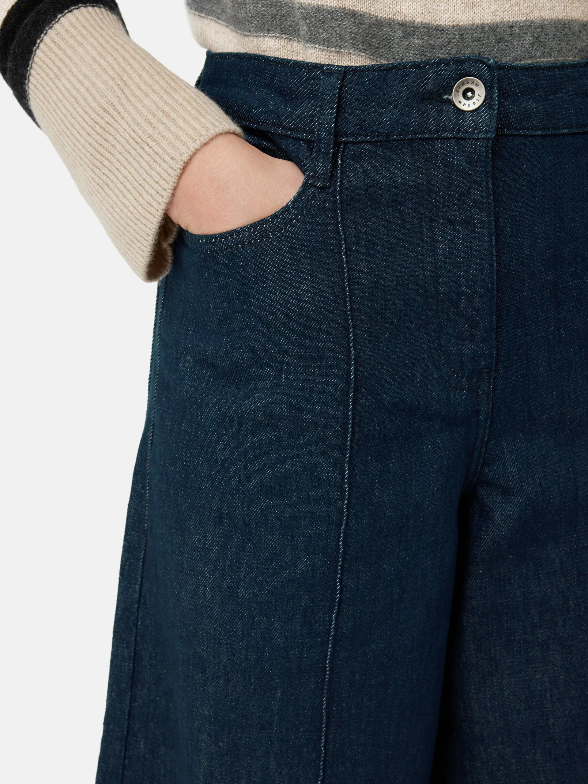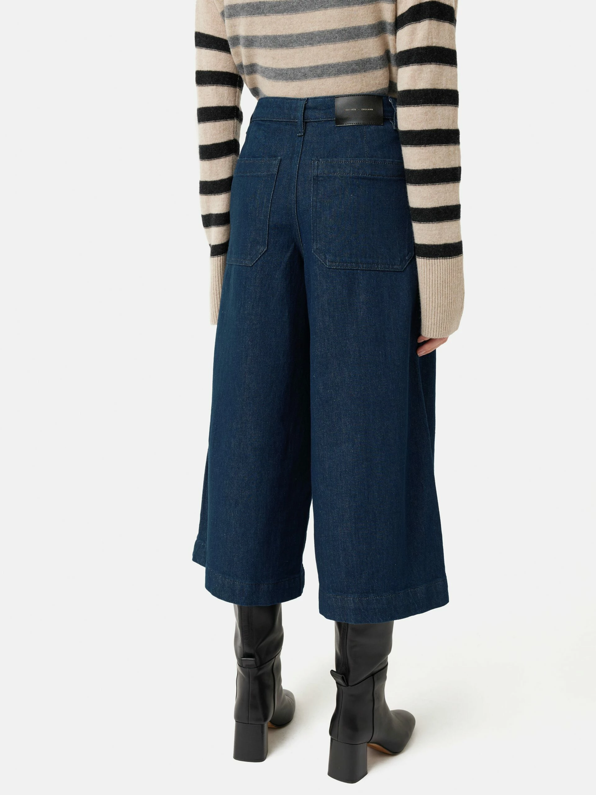 The wide cropped culotte is the newest addition to our denim collection. High waisted and cut in indigo cotton denim, with a hint of stretch. Features a fixed seam down the front, complemented by contrast topstitching, to add modernity to the silhouette. Style with a pair of long boots to accentuate the contemporary cropped leg.
