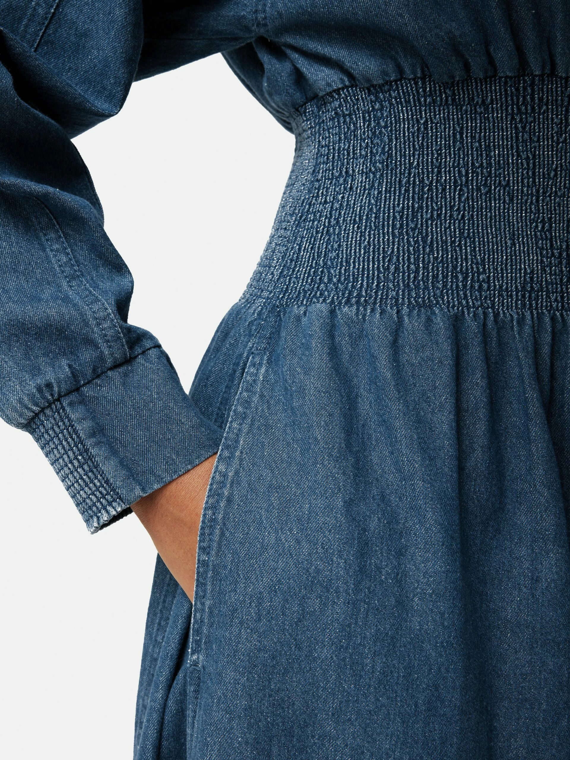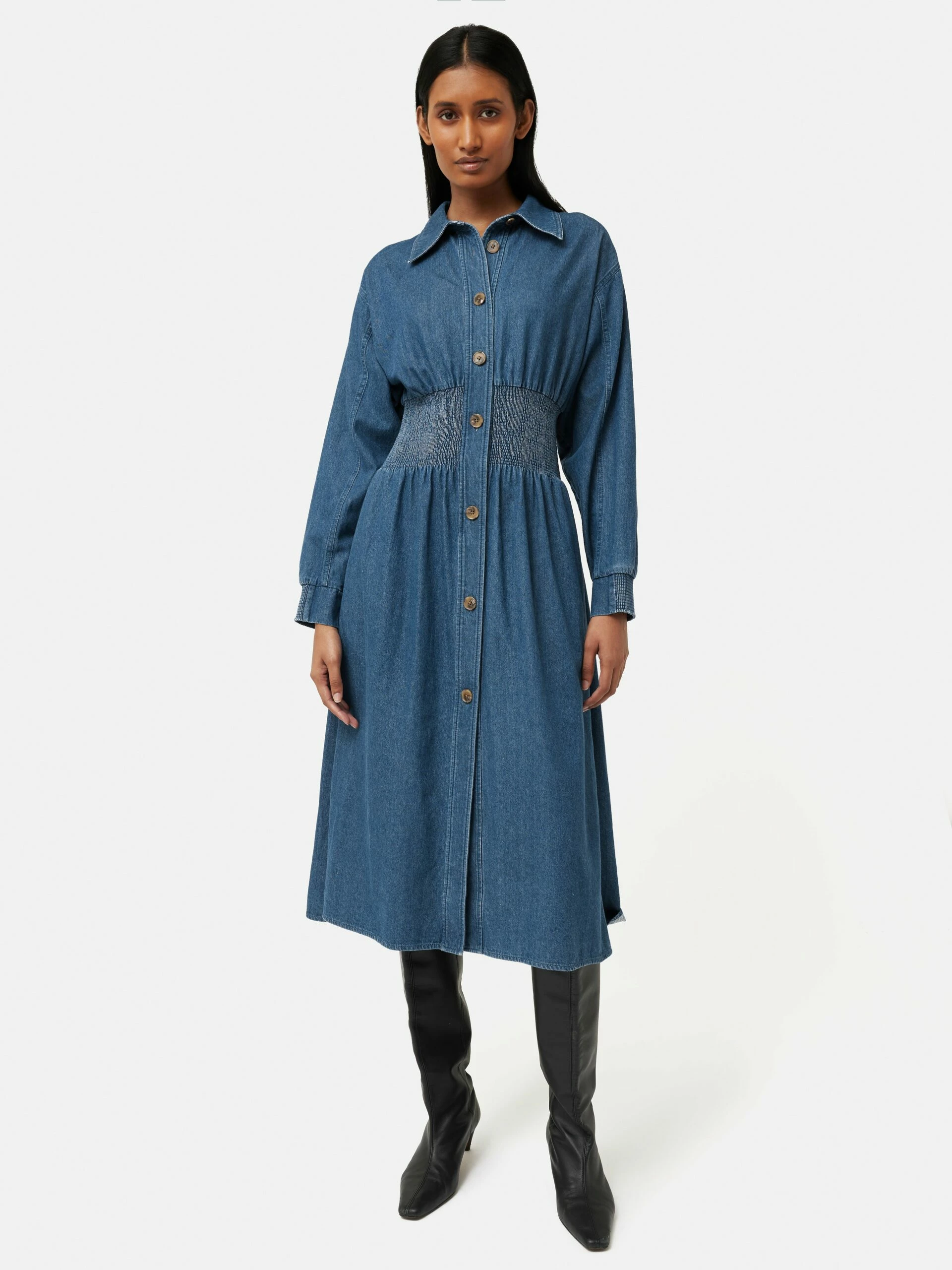 A new Spring staple, wear our mid weight light wash cotton denim shirt dress back with knee boots now and flat sandals later. An easy fitting shirt dress style with collar, contrast button to neck fastening, versatile deep smocked waist panel and smocked cuffs with a full skirt. Side pockets.