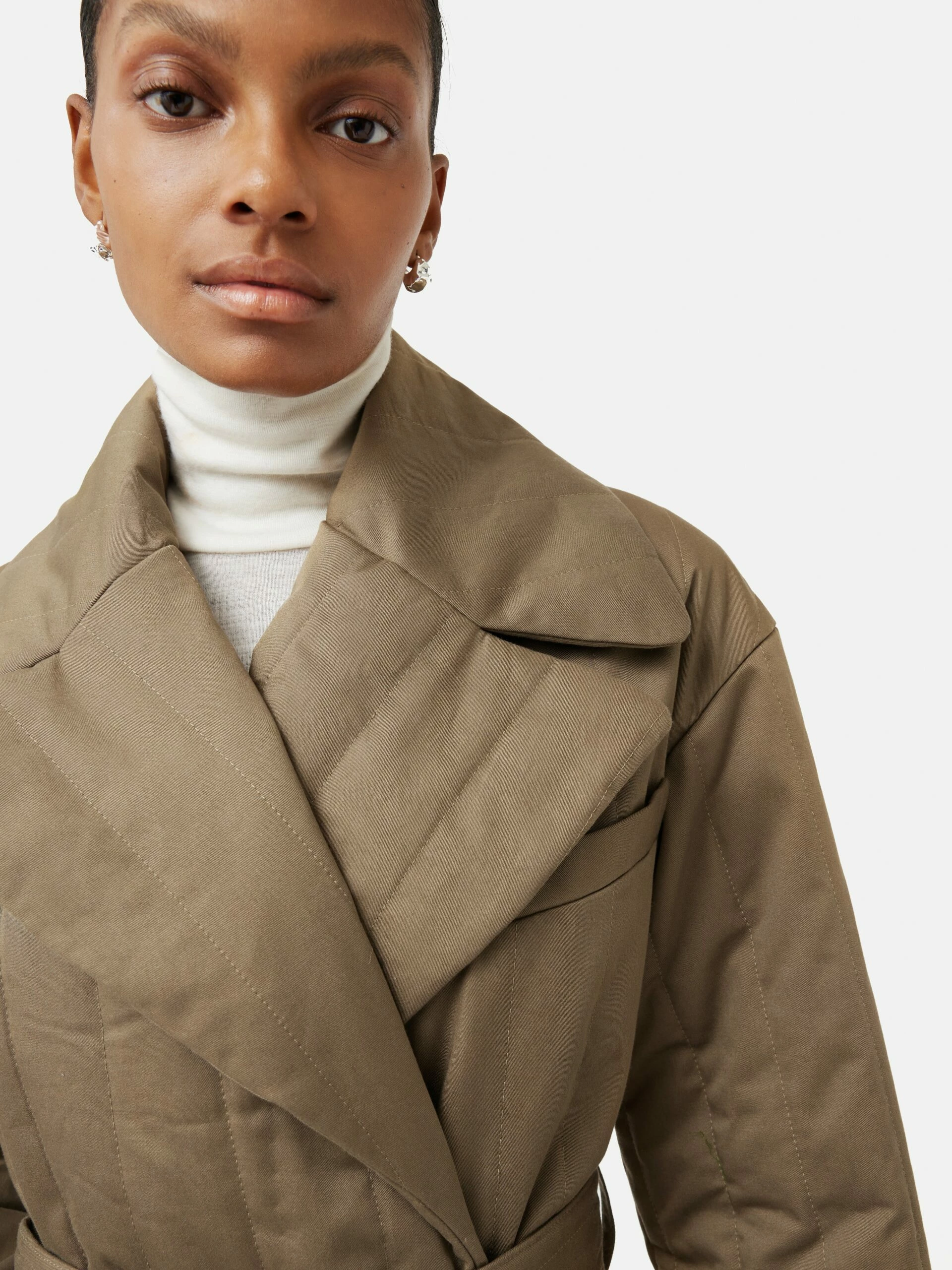 This supercharged puffer coat with a feminine twist is back in a contemporary shade of khaki. Made in Europe from an Italian heritage mill in Prato, and cut in our double breasted easy fitting Freya block this coat has a self belt and metal d-ring buckle fastening that lets you create a cinched-in silhouette. Attention to detail does not stop there, fully lined with contrast internal piping and self covered lapel snap details. Layer over tailoring for instant office chic or pared down with denim and a slouchy knit.