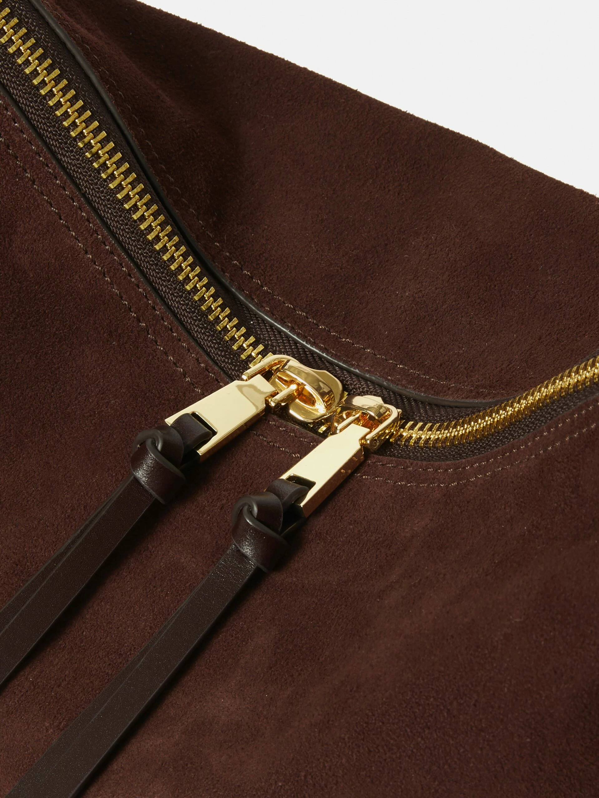 Our soft slouchy Trafalgar updated in a rich burgundy suede and trimmed with a smooth semi veg leather to add contrast. Finished with premium gold hardware, an adjustable shoulder strap and metal feet.