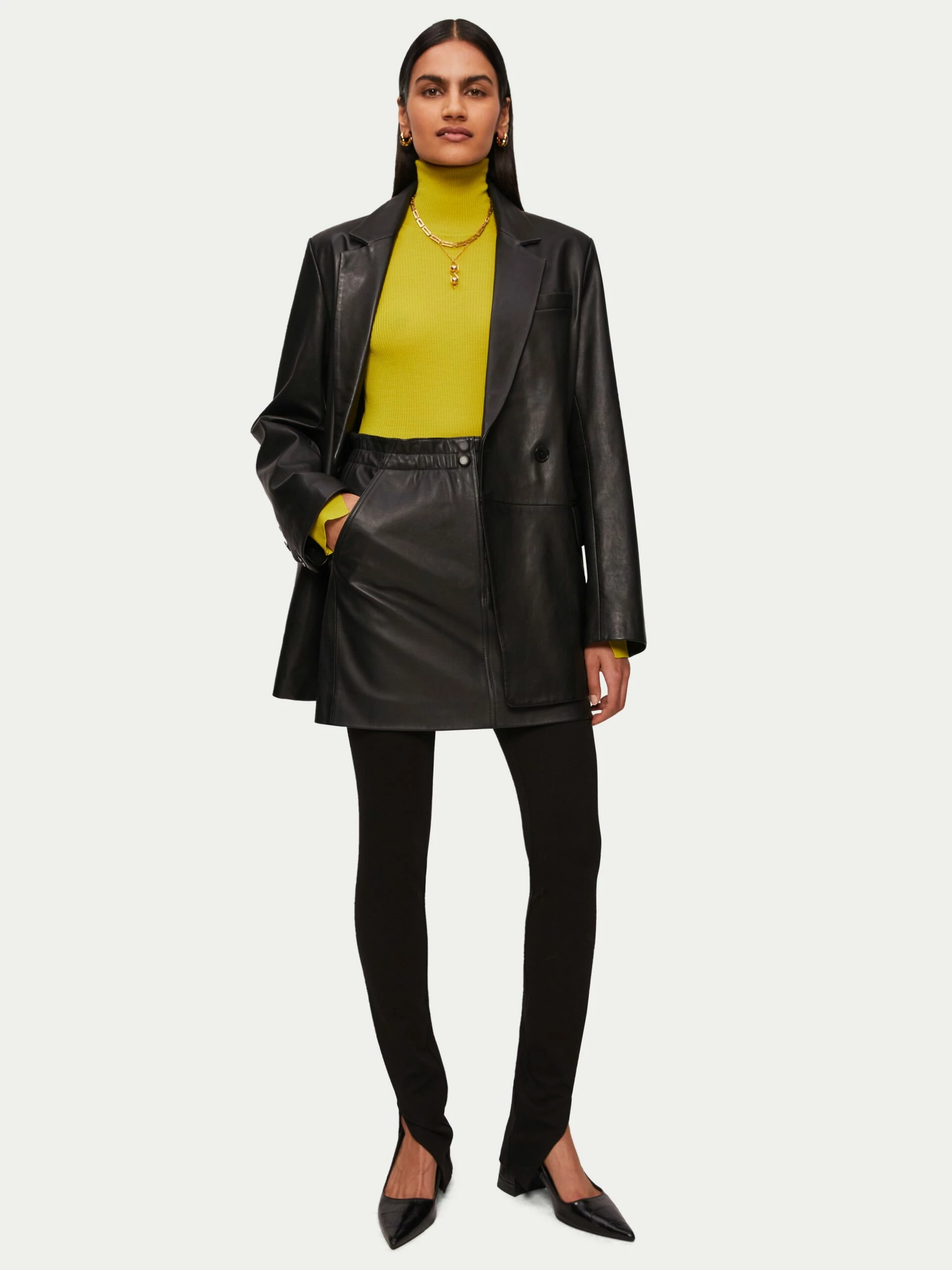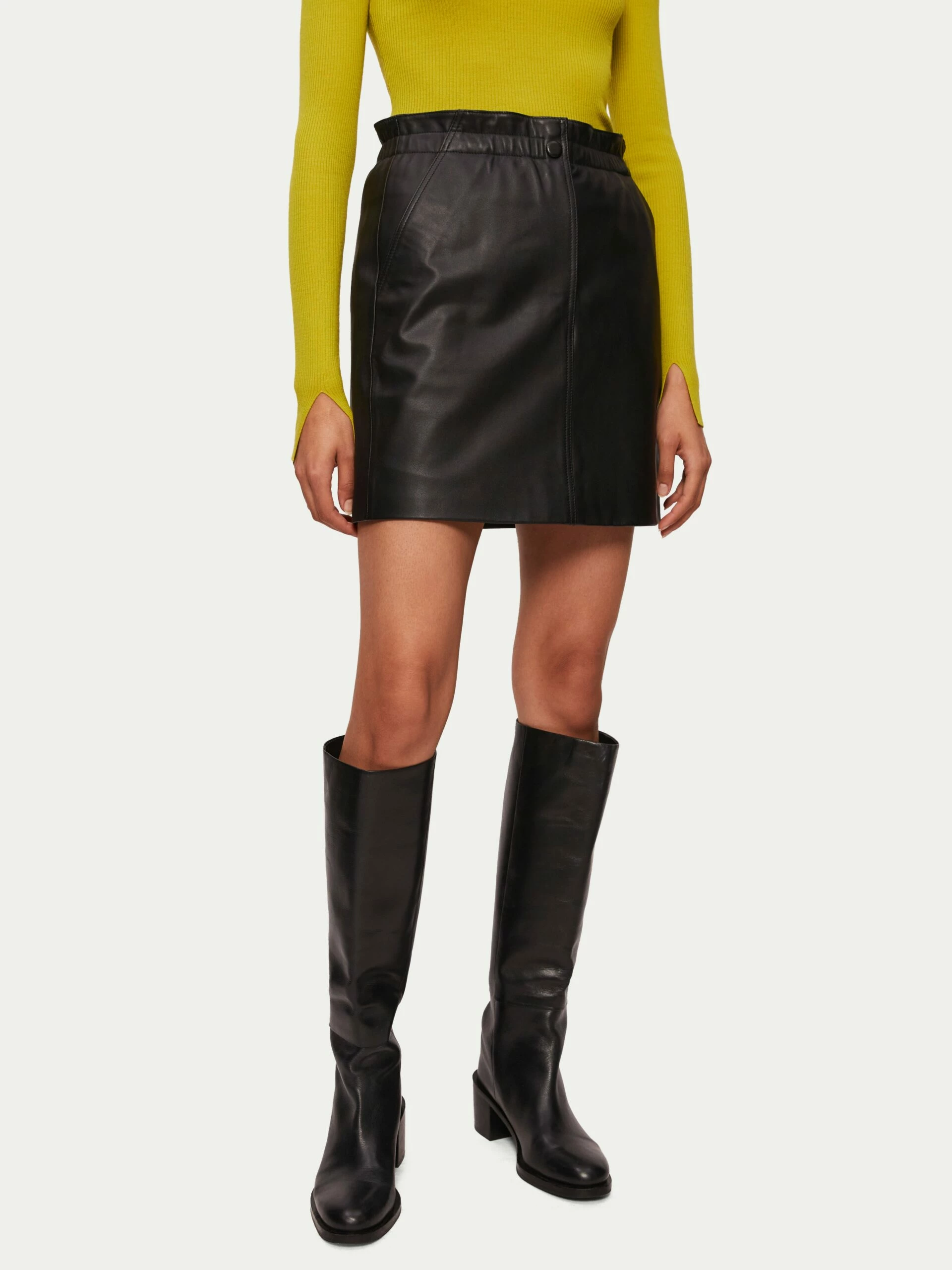 Cut in butter soft sheep nappa, this leather mini looks great paired back with a long slouchy sweater and a knee boots. Feminine ruched waist detail, leather covered snap fastening and zip front fly.