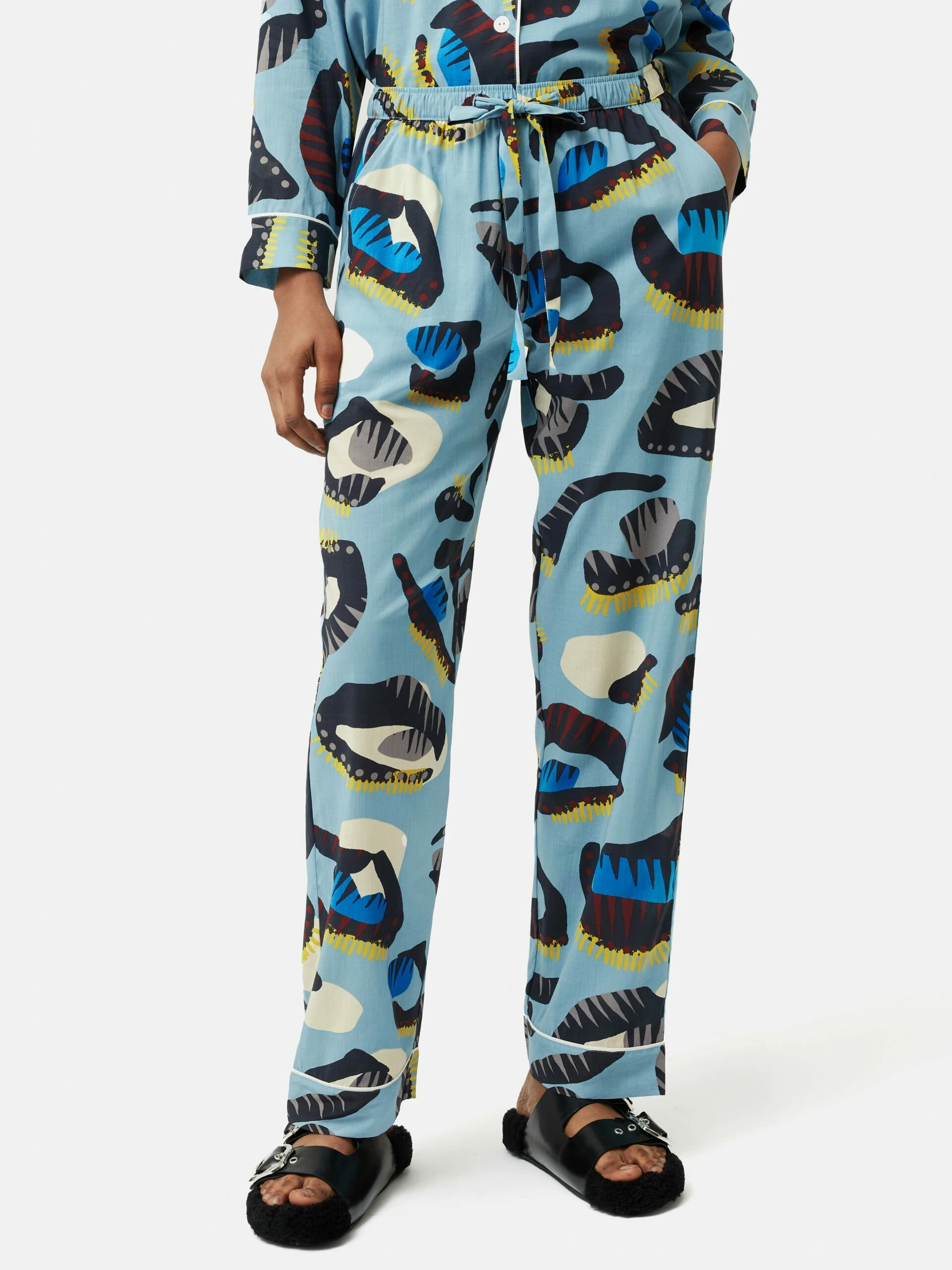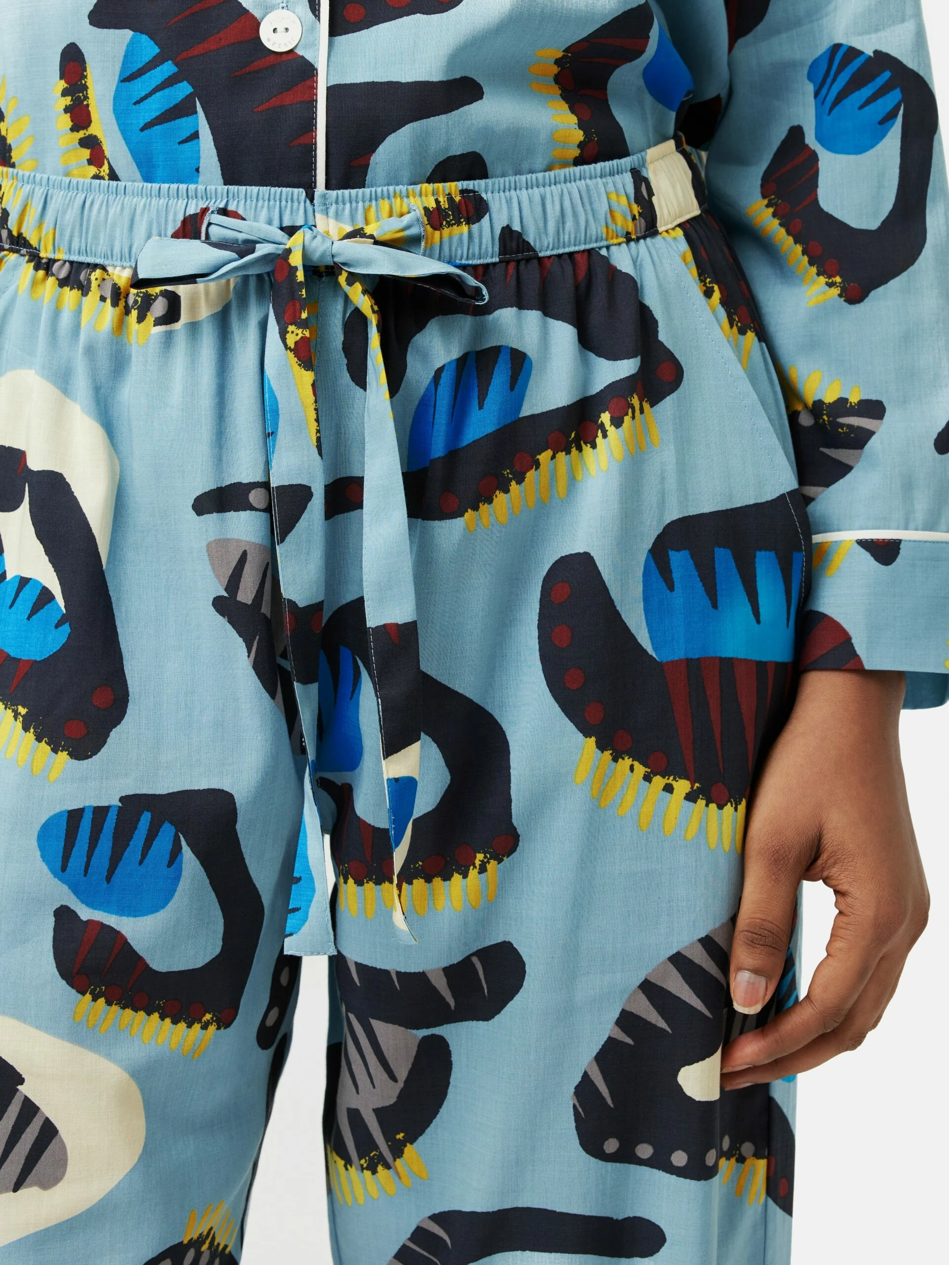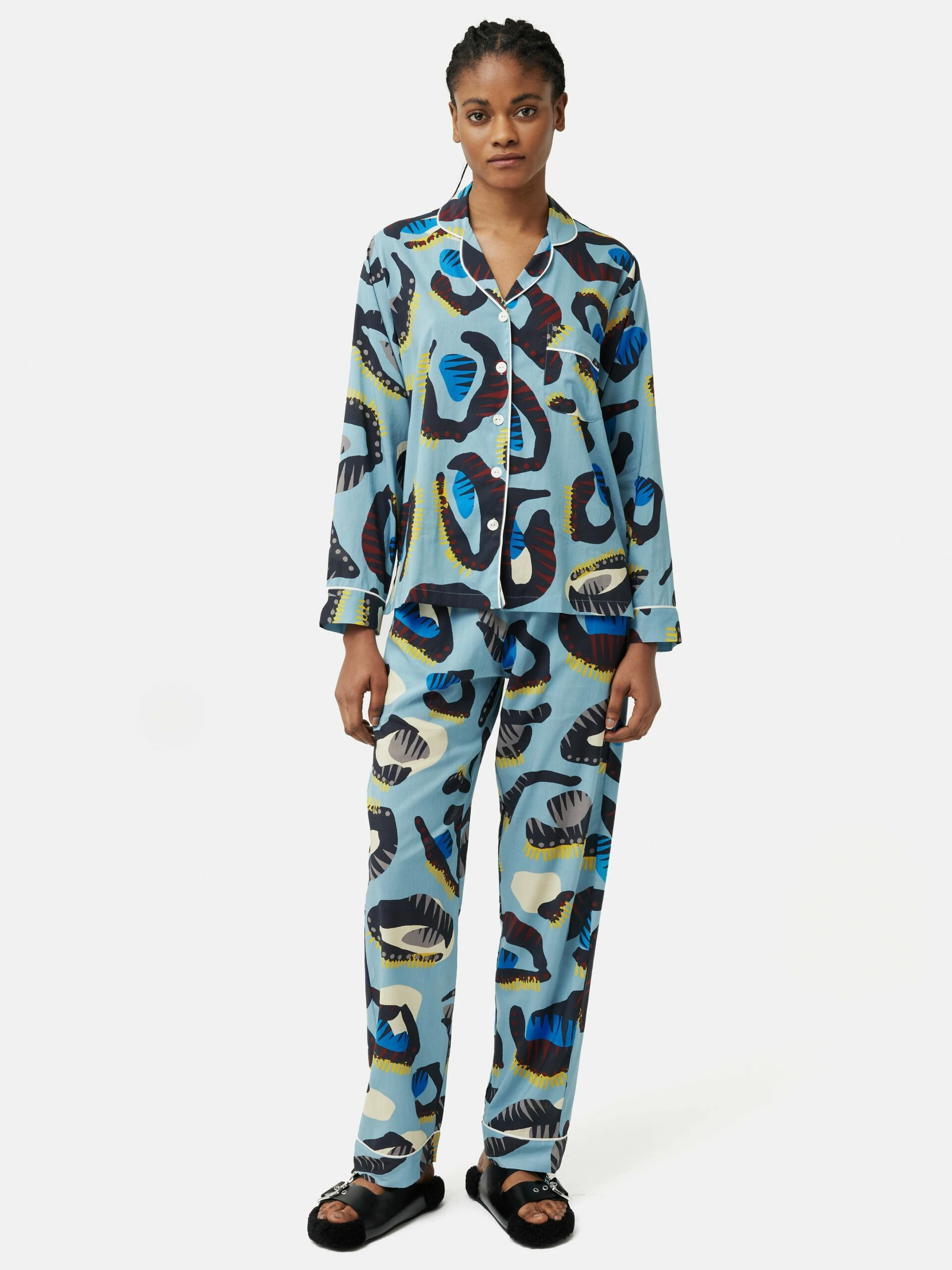 Our classic long length pyjama printed with our Leopard Eyelash print and cut in a soft and breathable cotton modal blend fabric, it has a contrast piping detail as well as embossed mother of pearl buttons. A comfortable, relaxed fitting shirt style with single chest pocket and easy drawstring waisted bottoms with side pockets.