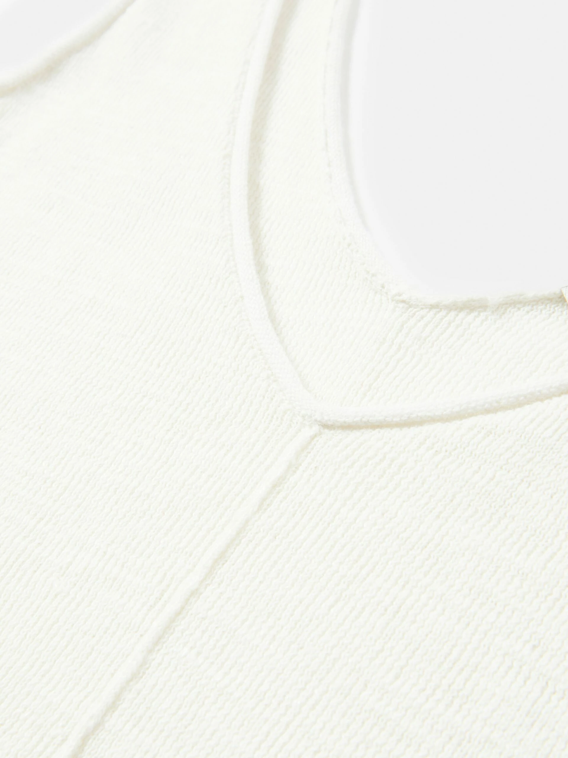 Fine gauge linen cotton knit tank vest. This simplistic style features tiny rolled knit edges and a fine centre seam detail. Designed with a slim fitting shape this tank has a minimal aesthetic and is an effortless underpinning for warmer days.