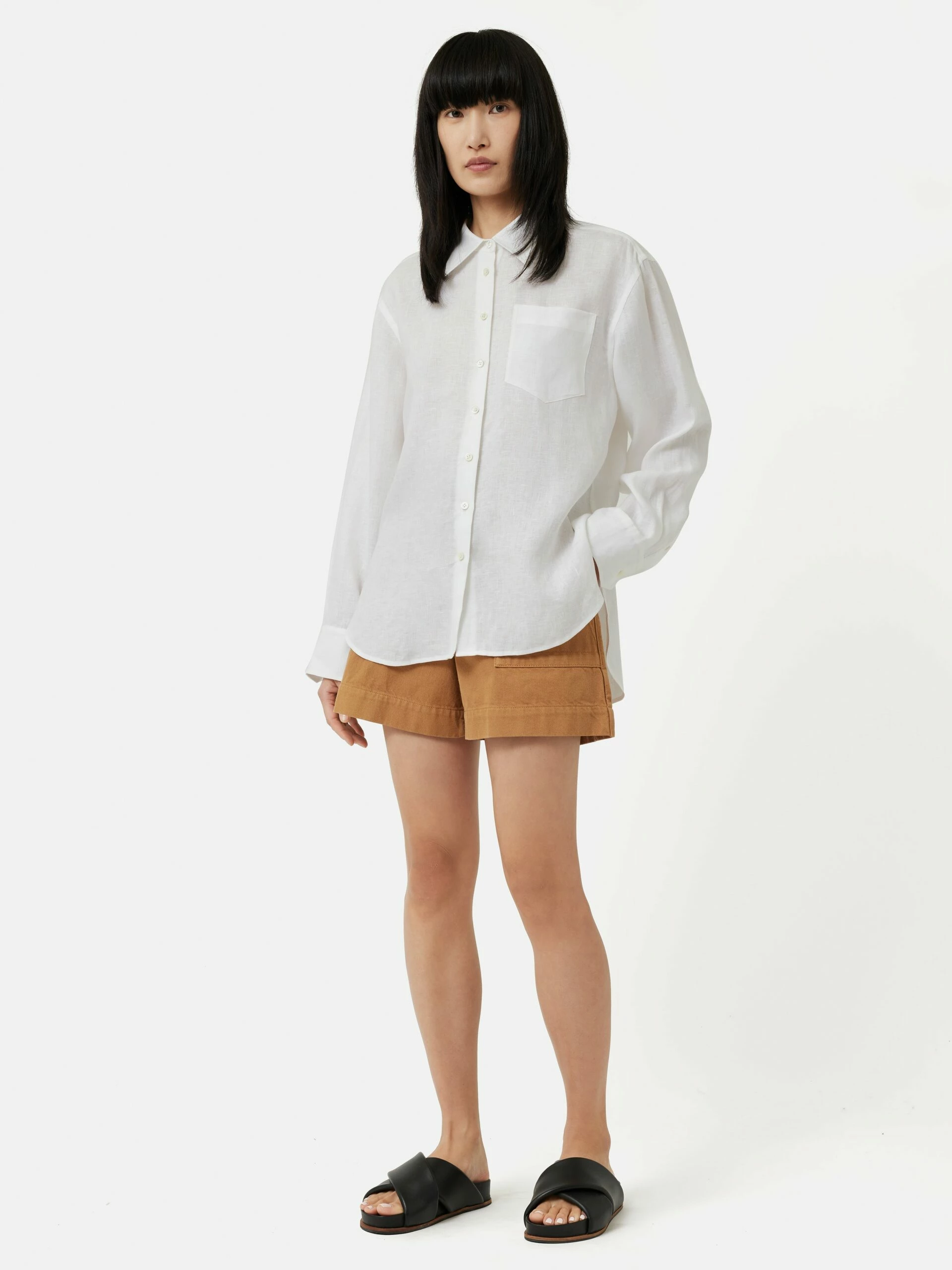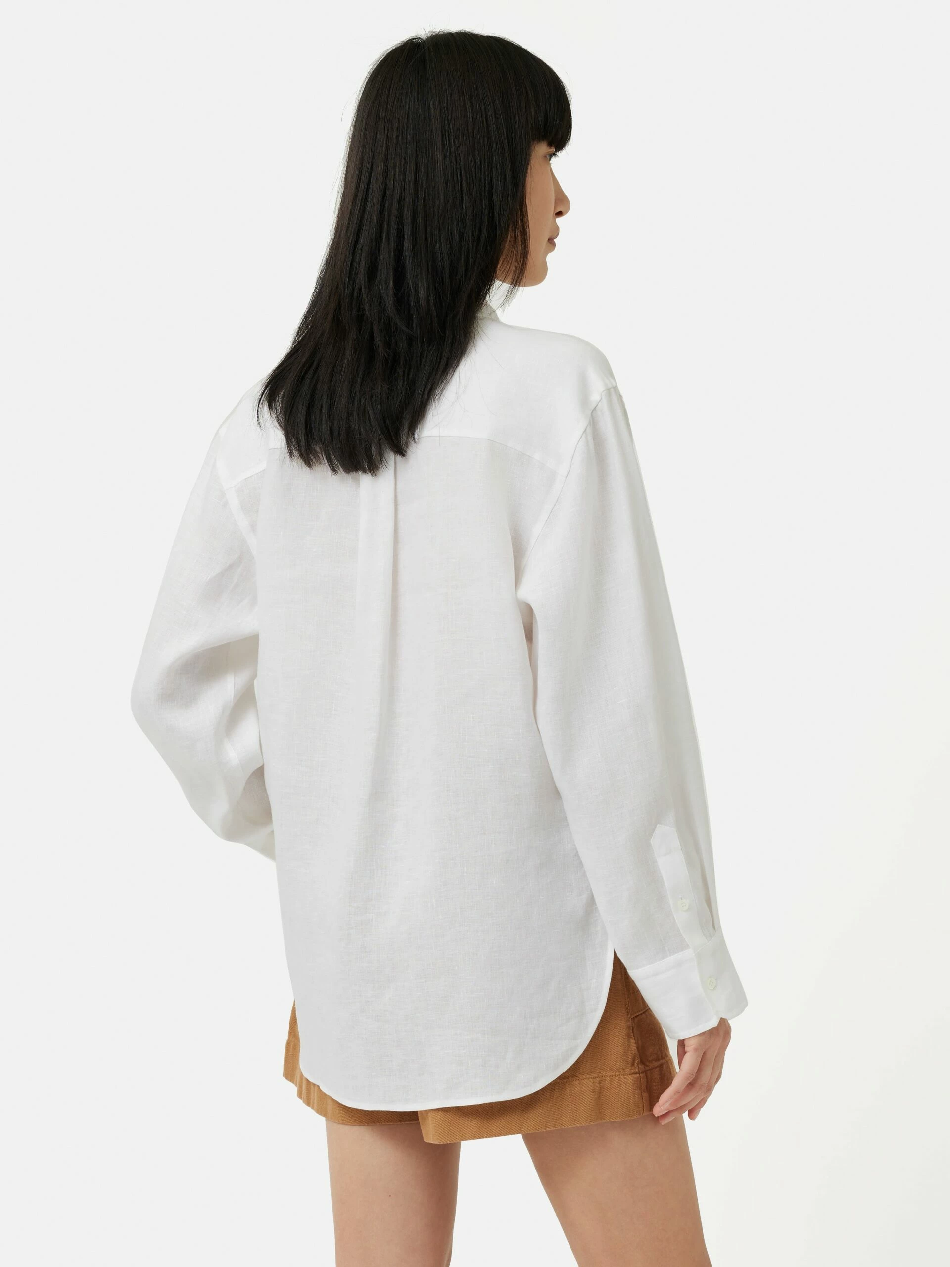 An oversized lightweight linen shirt. Features evocative of classic mens tailoring including a front patch pocket, side slits, a box pleat and scooped shape hem. Elevated by mother of pearl buttons and top stitch details. The oversized fit allows for an adaptable silhouette. This can be worn tucked in or untucked with sleeves rolled up or down. Pair with some buttery leather separates for a clean and crisp finish.
