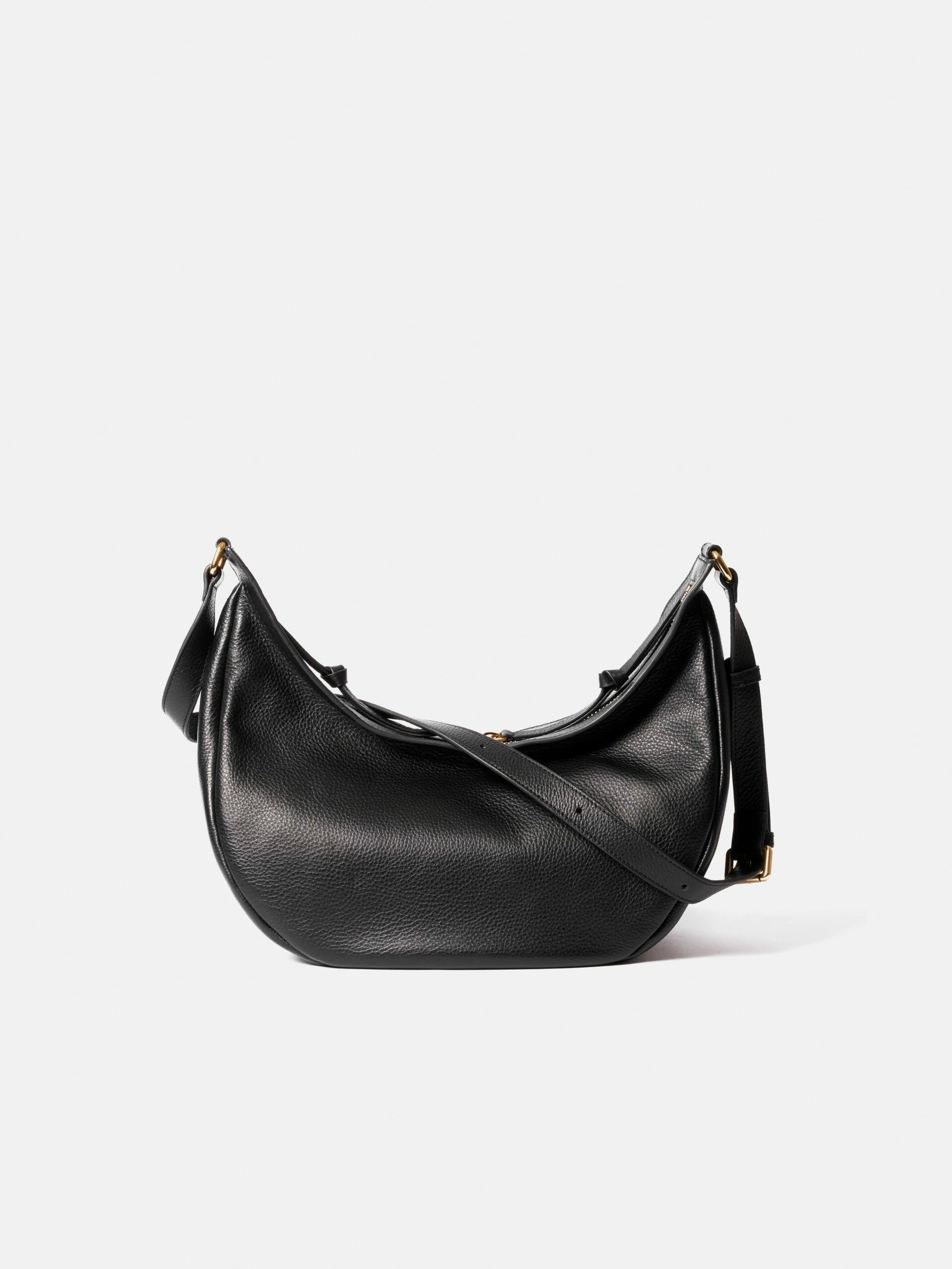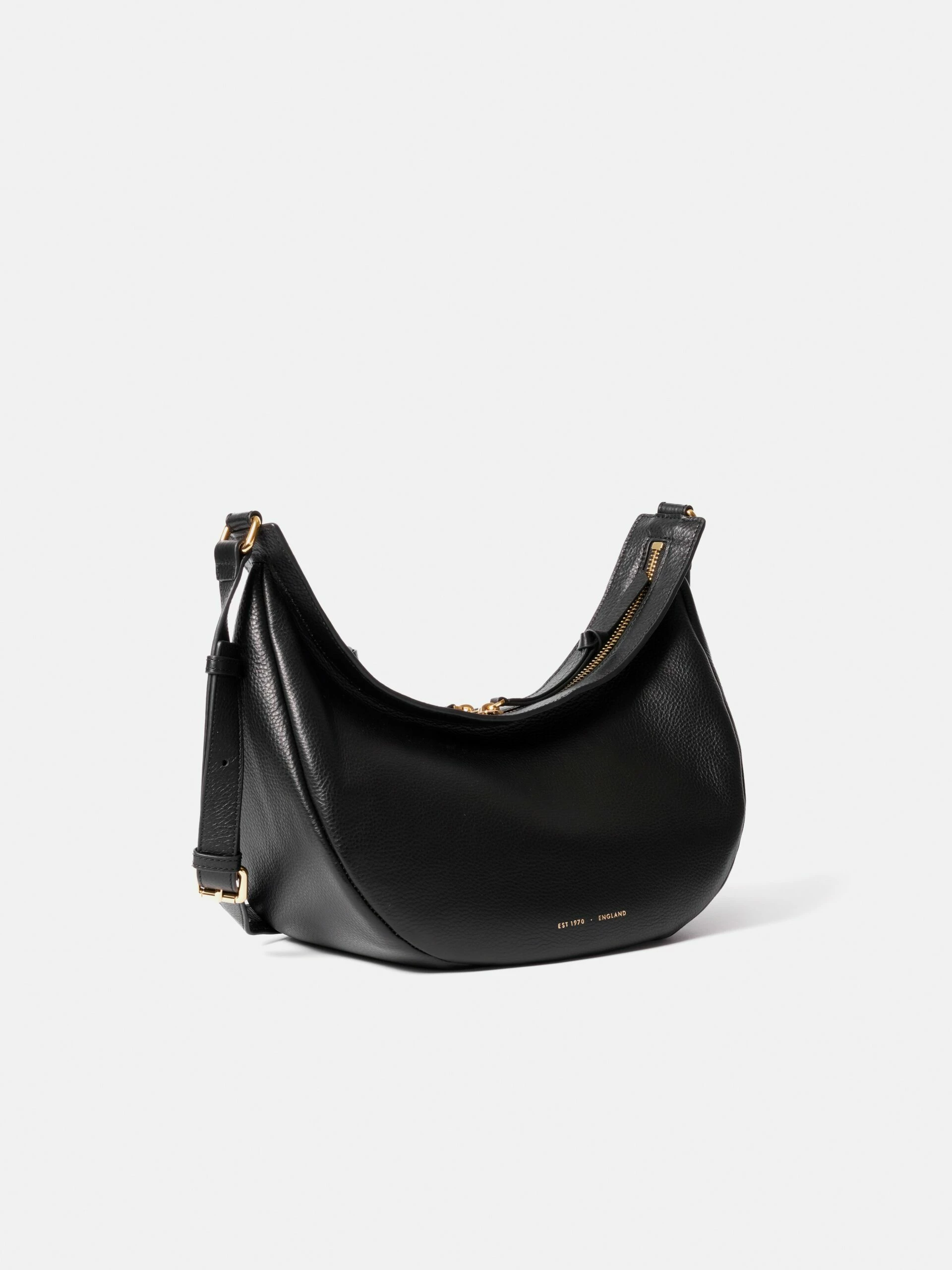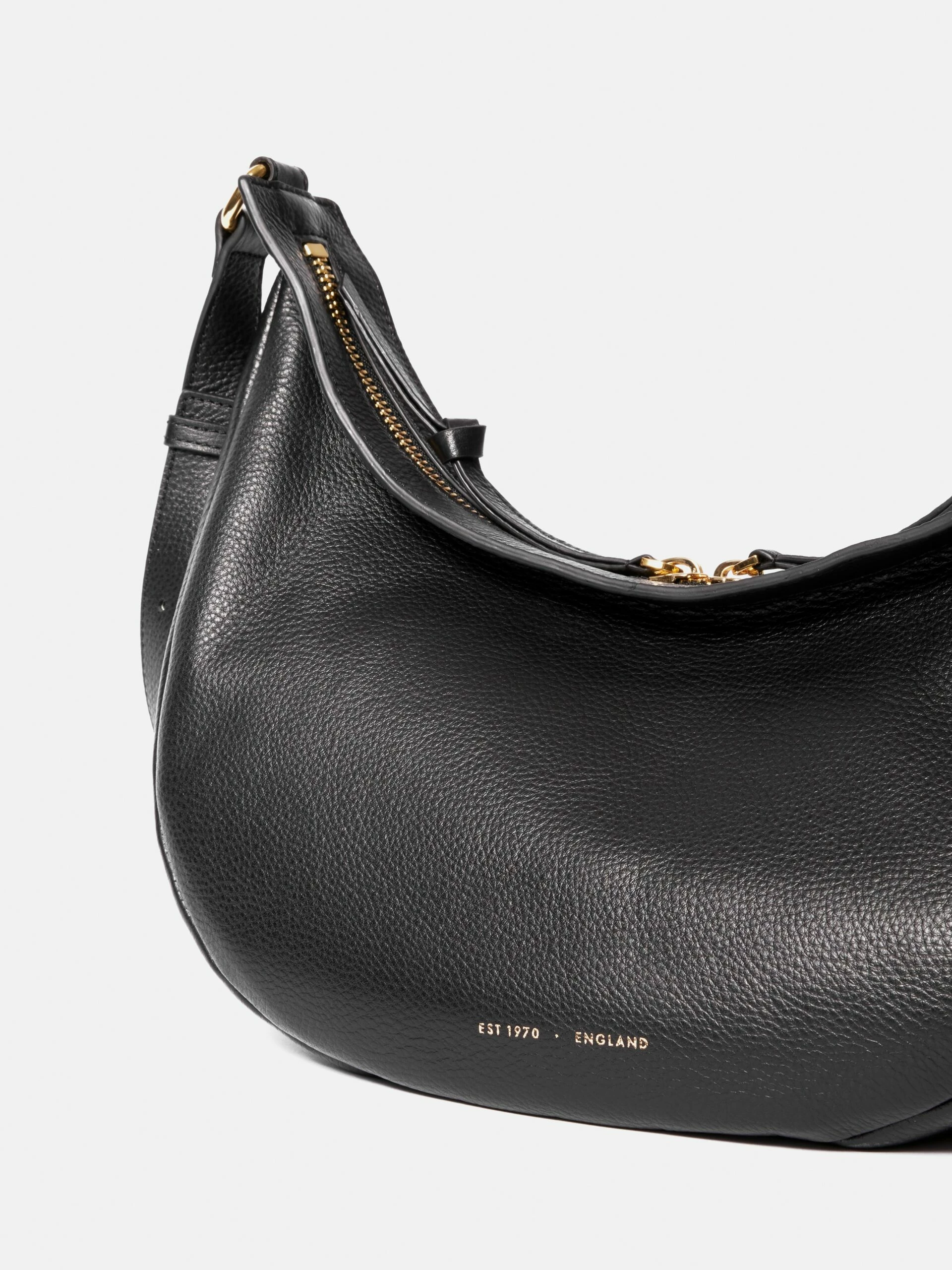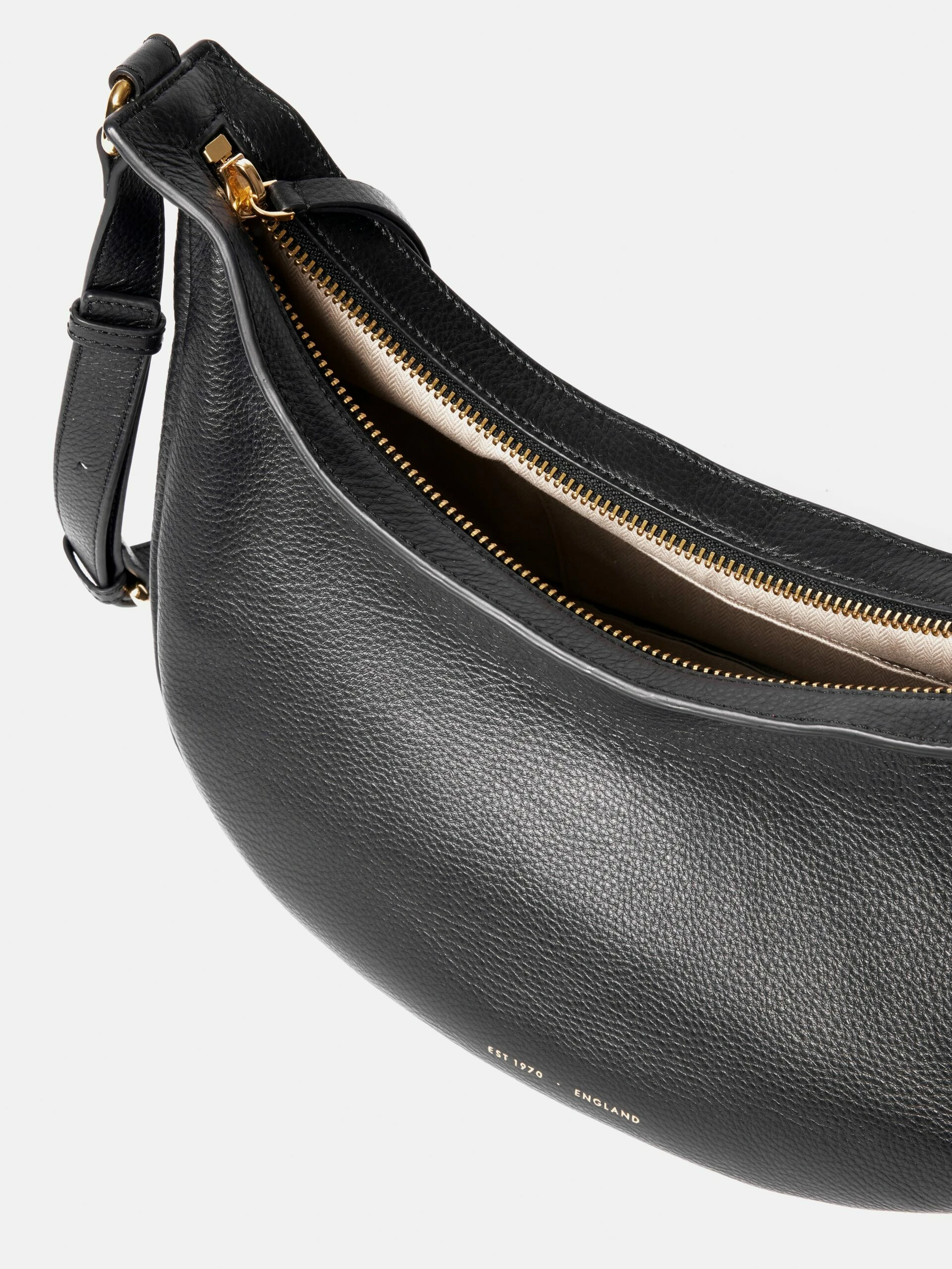 Our classic soft slouch shoulder bag, now available in black, supple, natural grain leather and trimmed with veg tanned leather. This practical style has zipped top closure and fully adjustable strap. Lined with cotton fabric, the interior features a flat back pocket for organising your essentials.