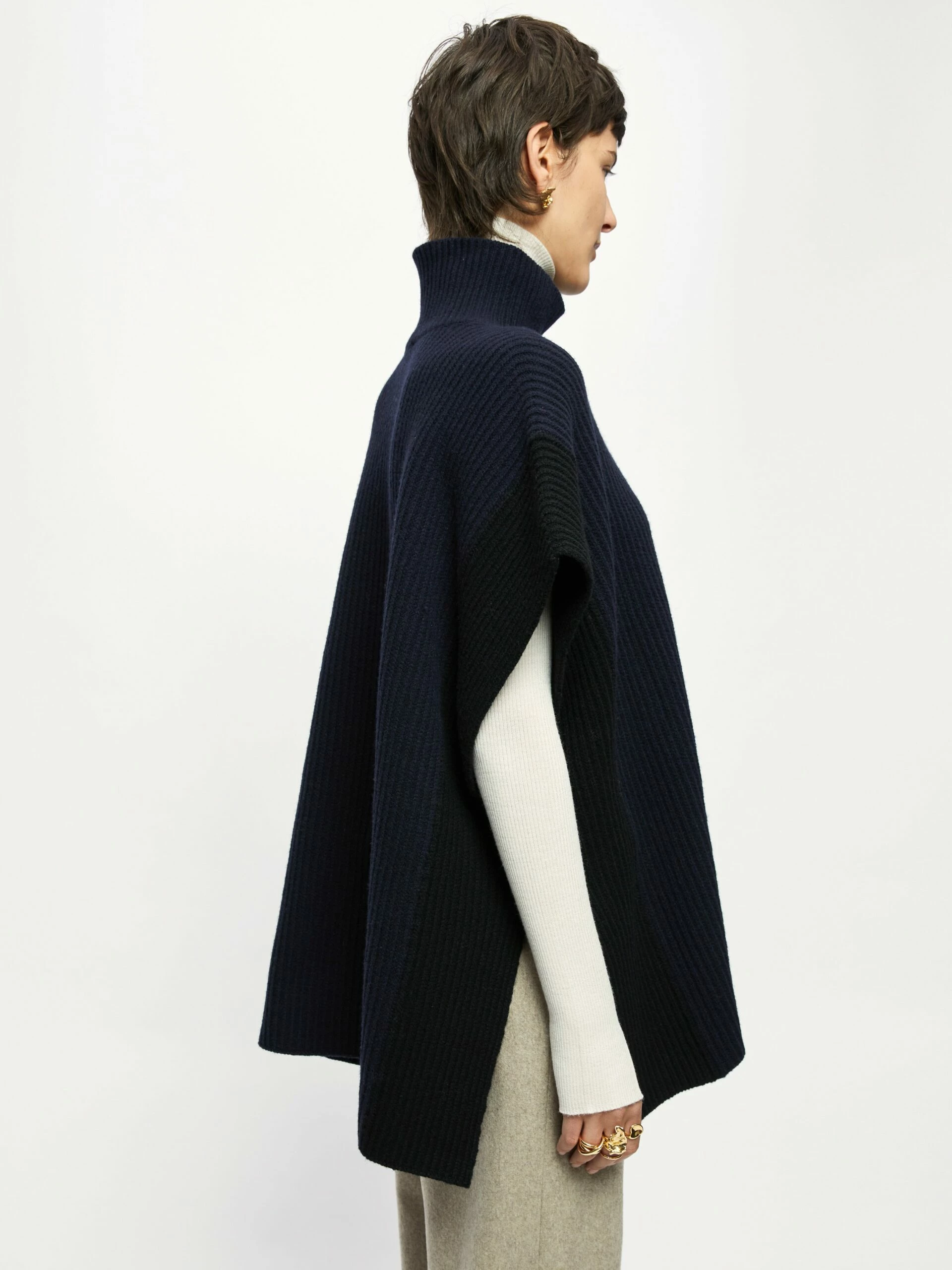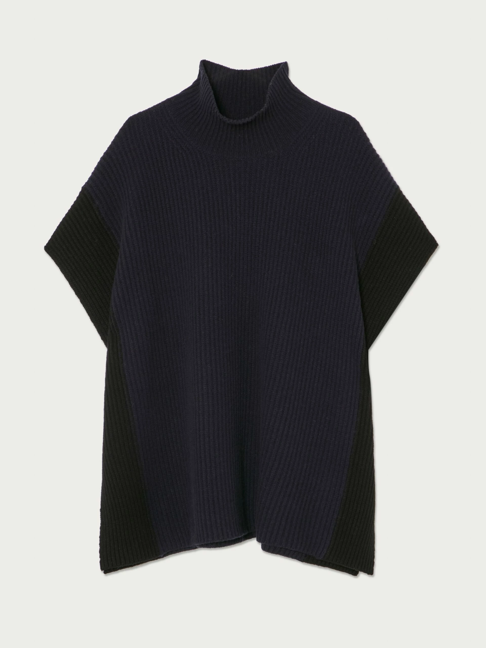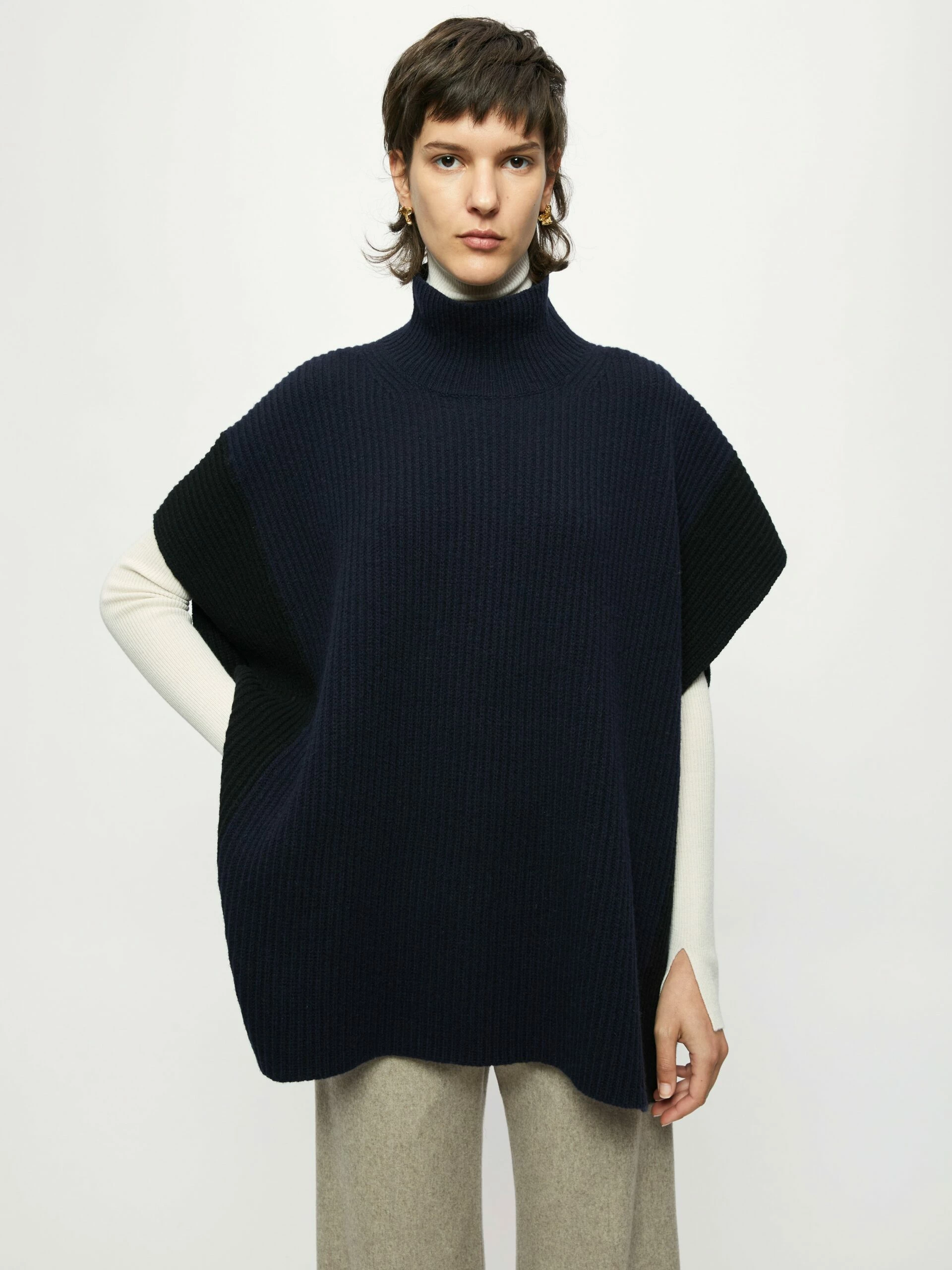 Modern rib knit poncho in 100% merino wool. High neck. Linked arms. To wear on top of shirts or jumpers. Great layering piece