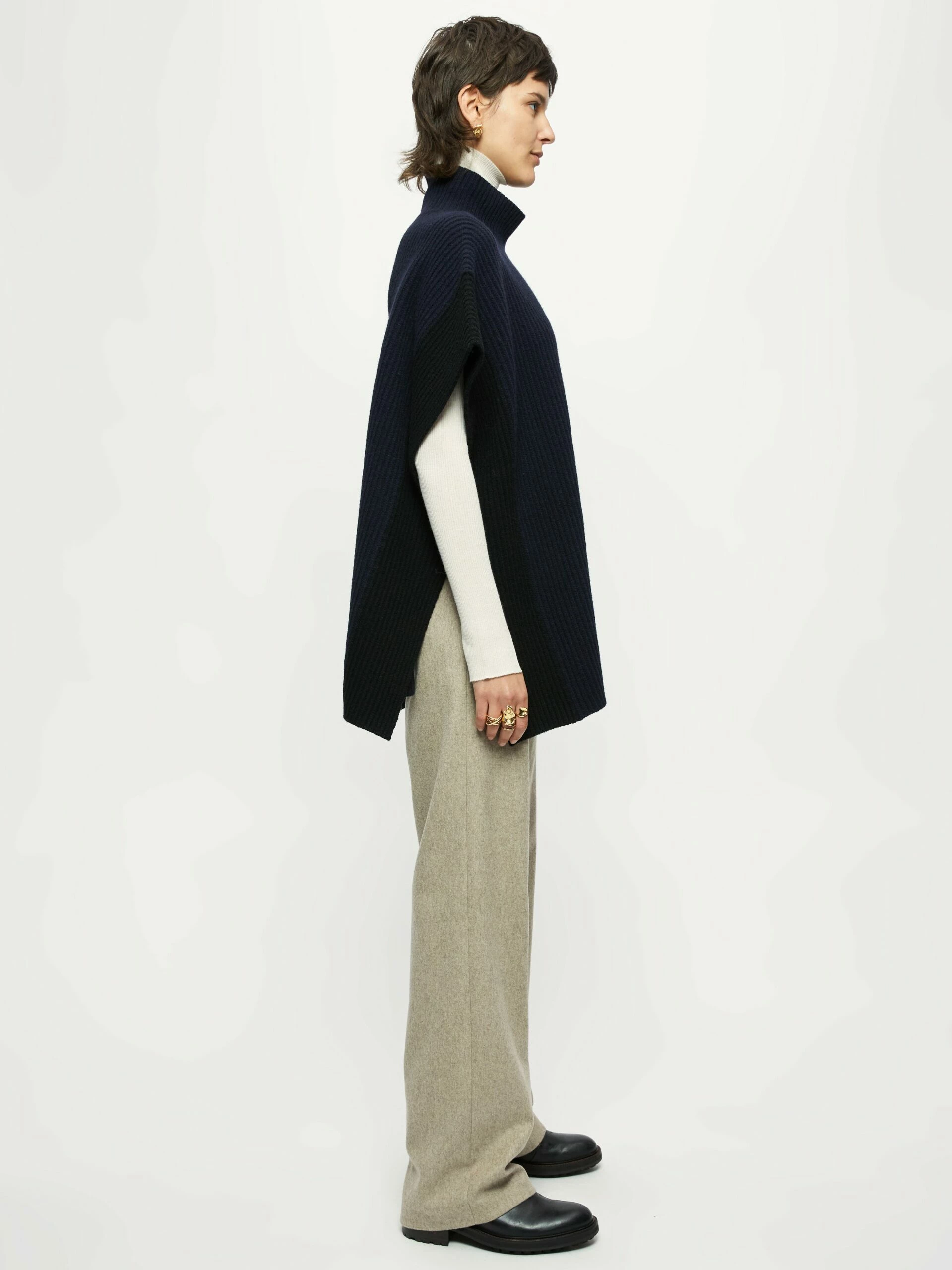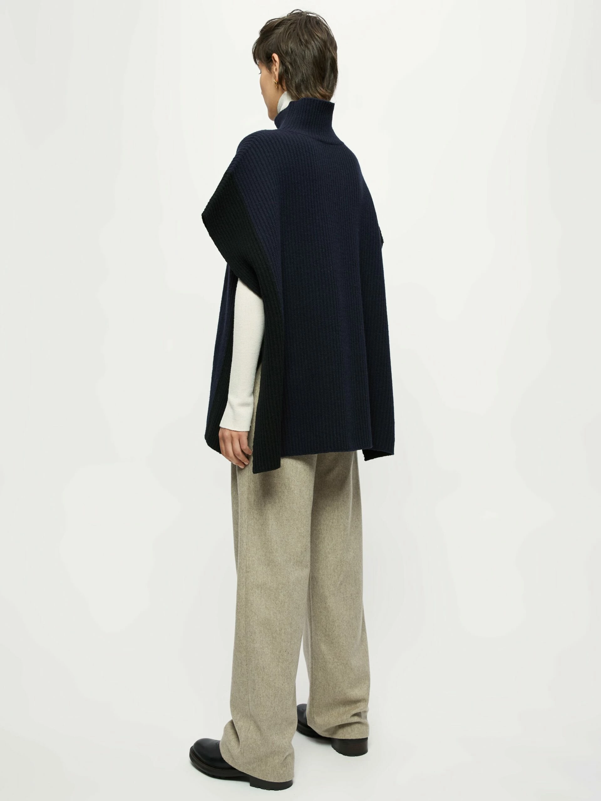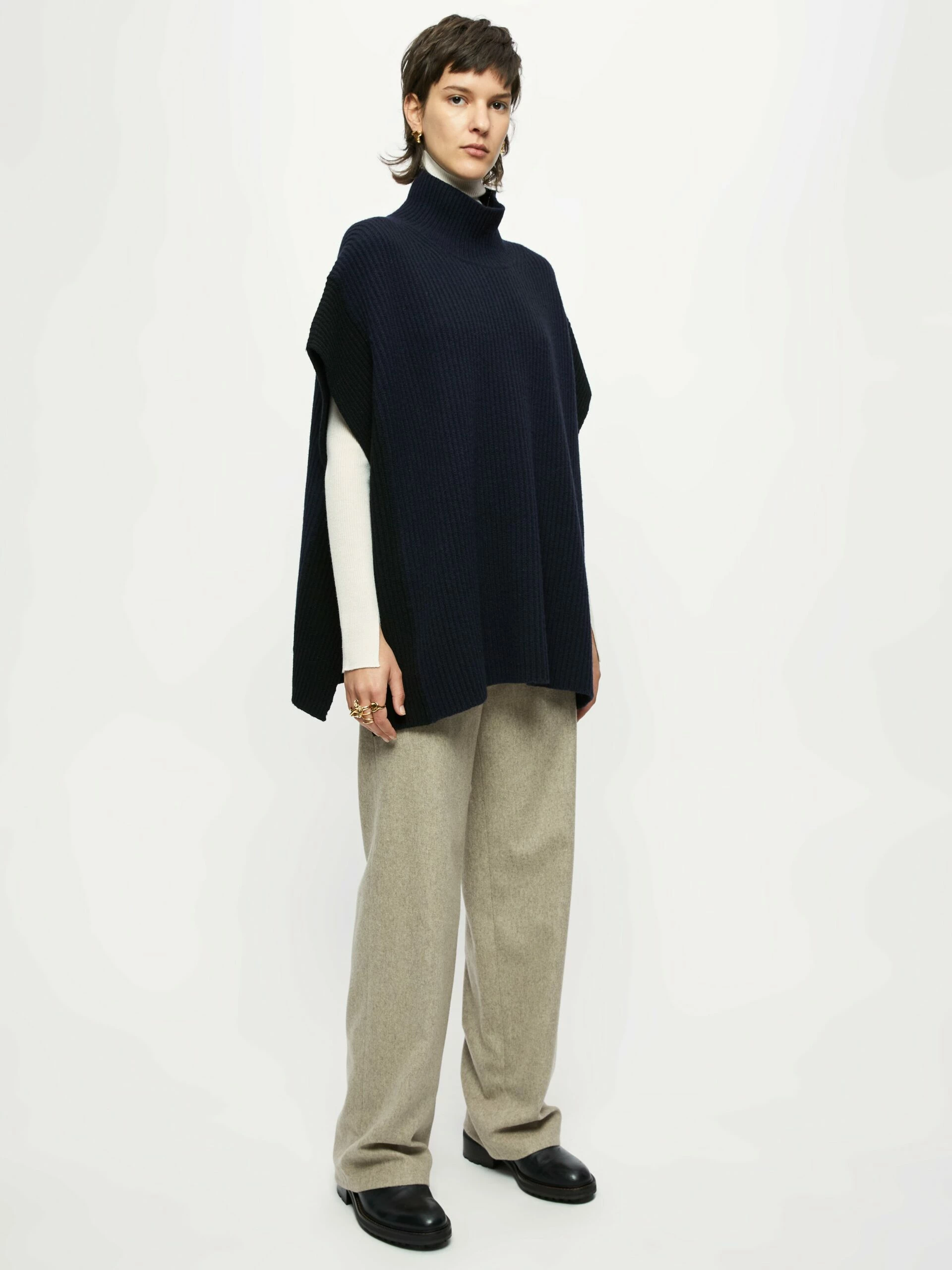 Modern rib knit poncho in 100% merino wool. High neck. Linked arms. To wear on top of shirts or jumpers. Great layering piece