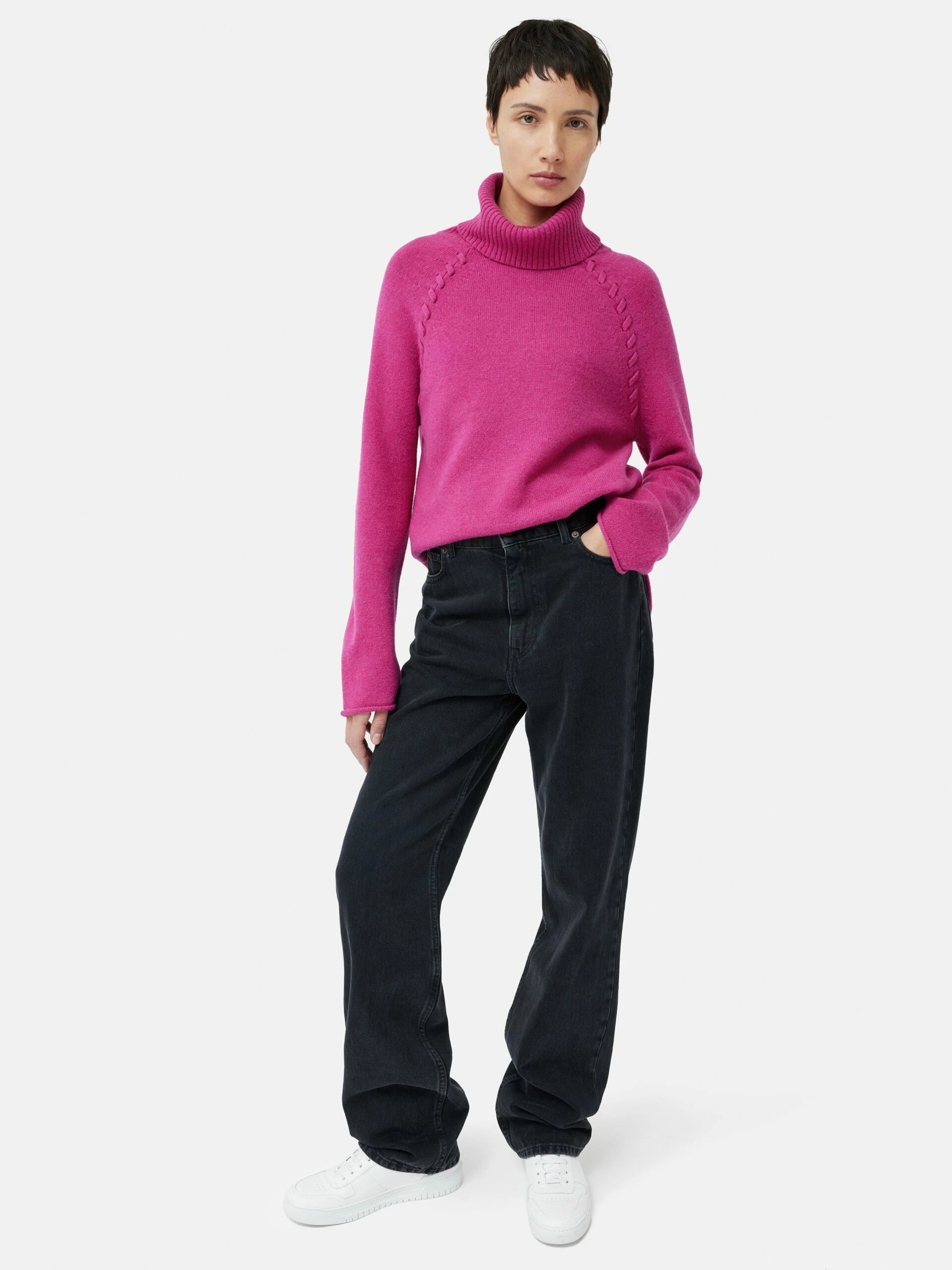 Supersoft merino relaxed jumper featuring beautiful handcrafted overstitch detail at the raglan seams. Designed with a loose fit and long scooped hem to cover the hips. The slouchy deep neck can be pulled up around your chin to keep out the cold.