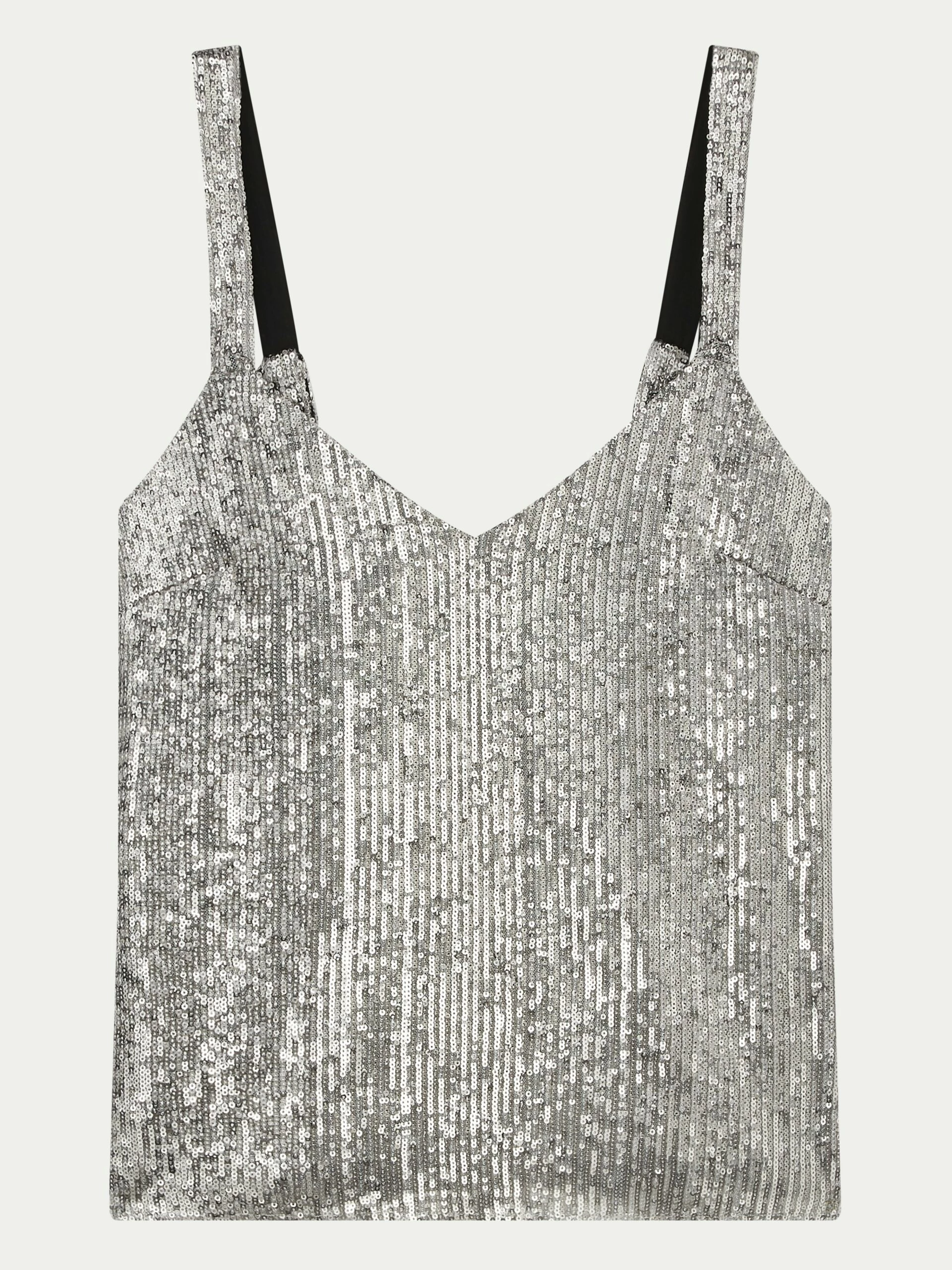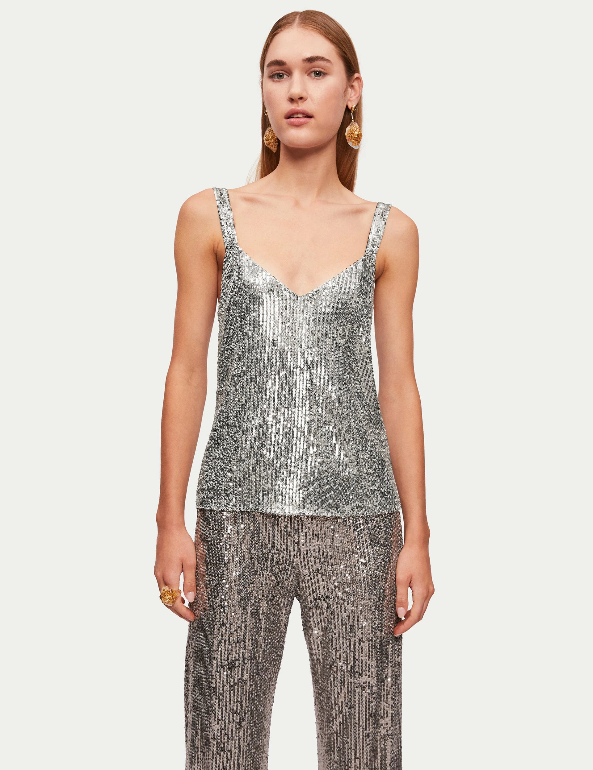 Simple yet chic, this mini sequinned cami top has adjustable, wide straps for ease of wear with a flattering v neckline. Wear with matching palazzo trouser for a more statement look or laid back with denim and leather styles. Fully lined for comfort.