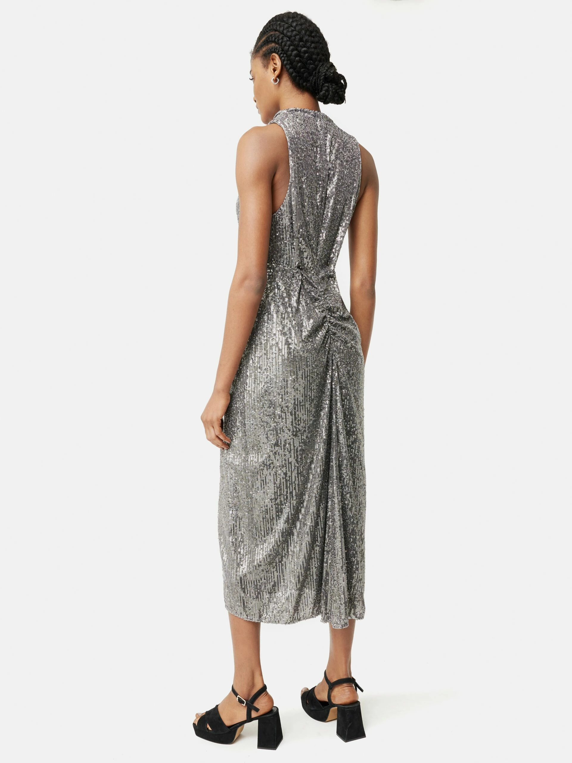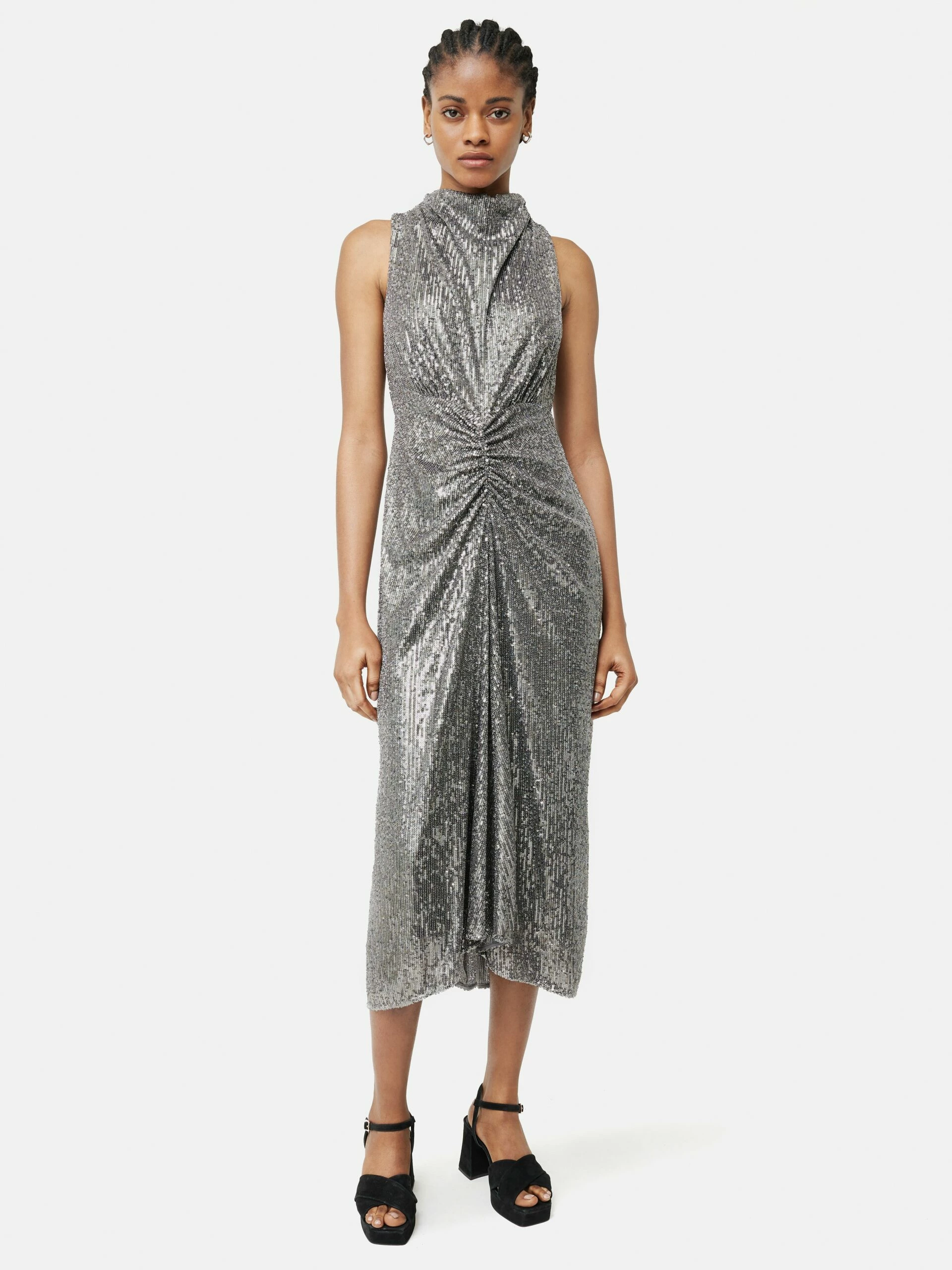 An update on our iconic sequin midi dress; switching out the V neckline for a more feminine cowl neck. Designed with ruched detail on the front and back seams to create a beautiful draped silhouette and flattering fit. Fully lined with a knitted stretch base for extra comfort. Style with heels or boots to curate the ultimate show-stopper.