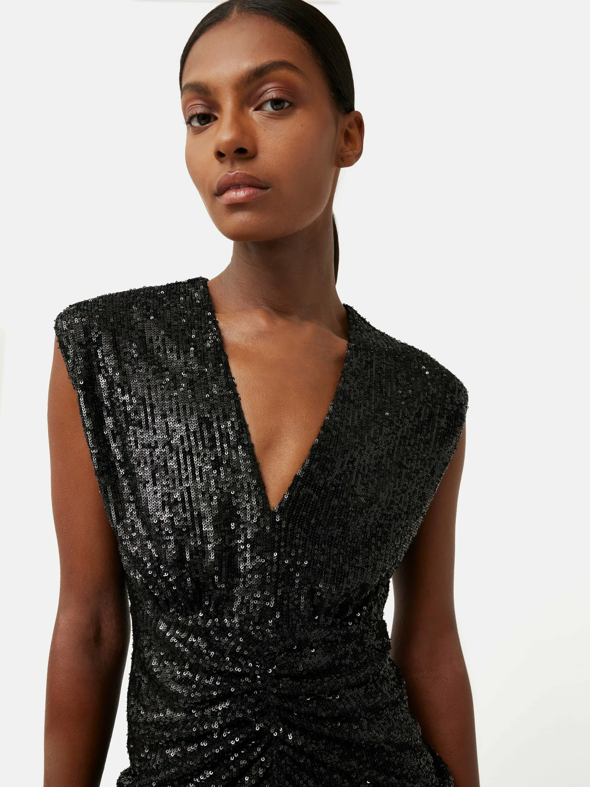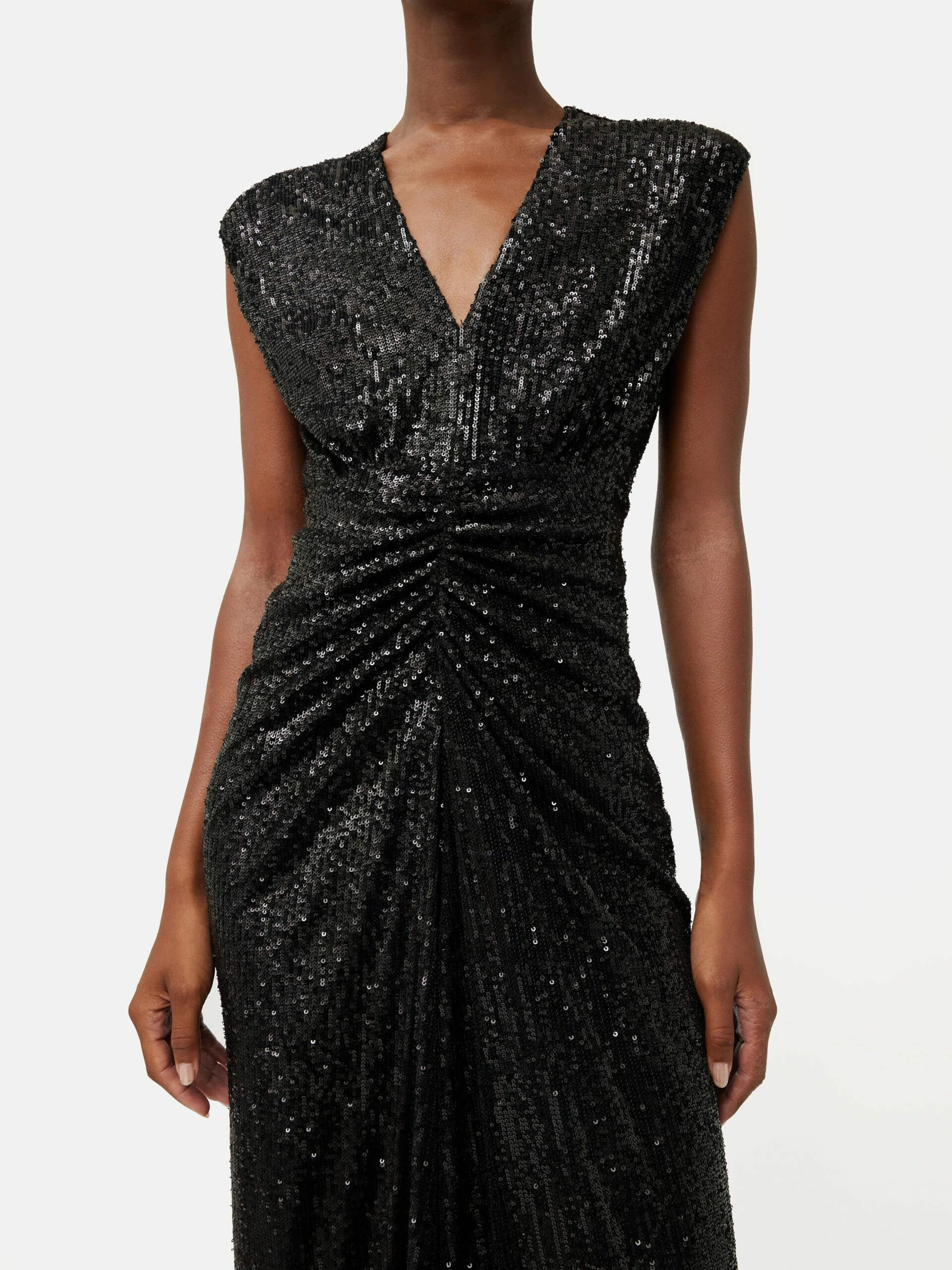 A stylish show-stopper. A sequin midi dress, designed with ruched detail on the front and back seams to create a beautiful draped silhouette and flattering fit. Features a v-neckline and gentle cap sleeve. The perfect occasion dress, style with heels or boots.