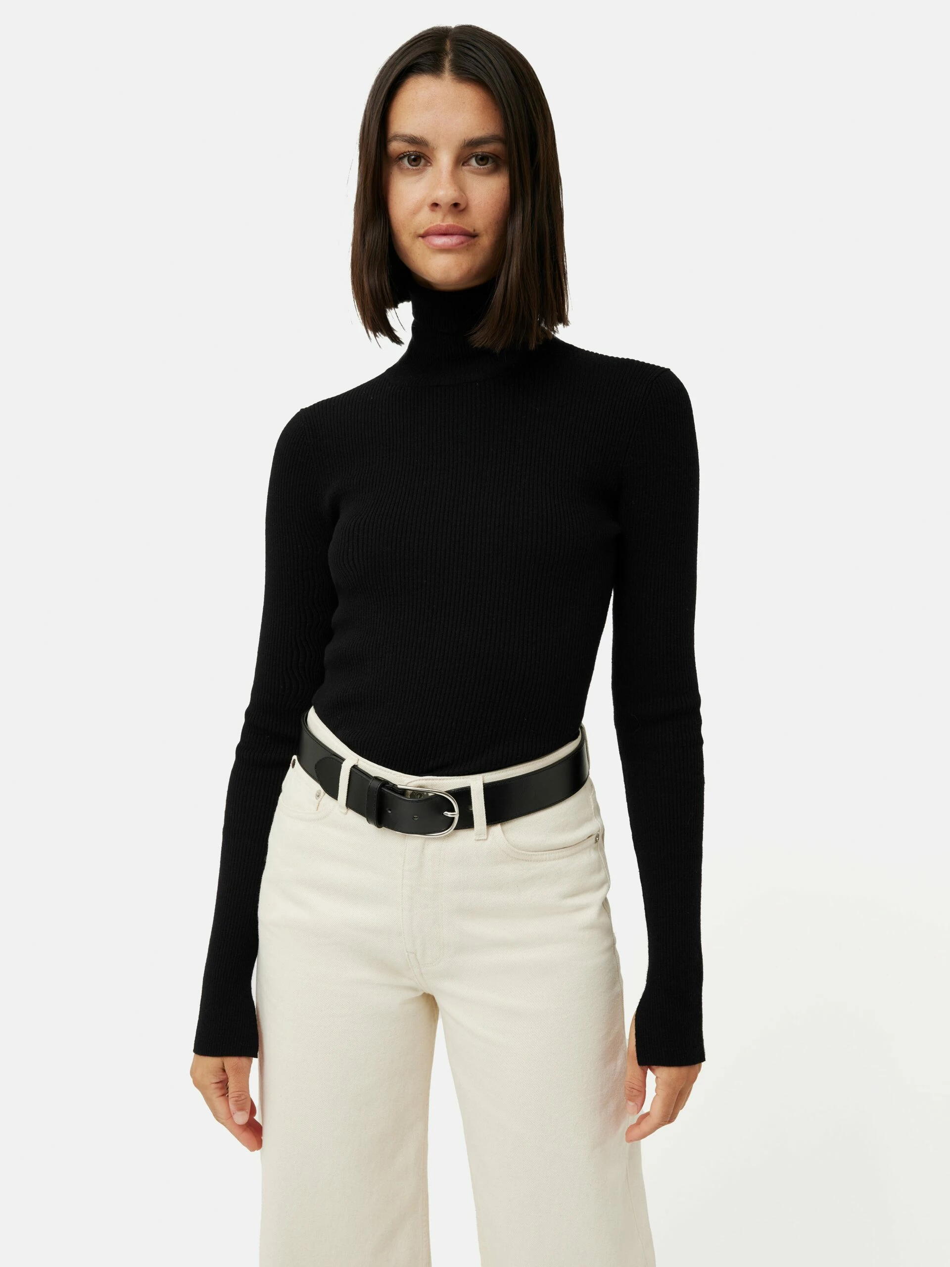 Elevating the classics, a chic polo neck from the front with a sartorial slash back detail is knitted in a super soft viscose wool blend. A body-skimming style that looks ultra flattering styled under oversized tailoring. Thoughtfully designed, the slash is high enough to wear with normal underwear.