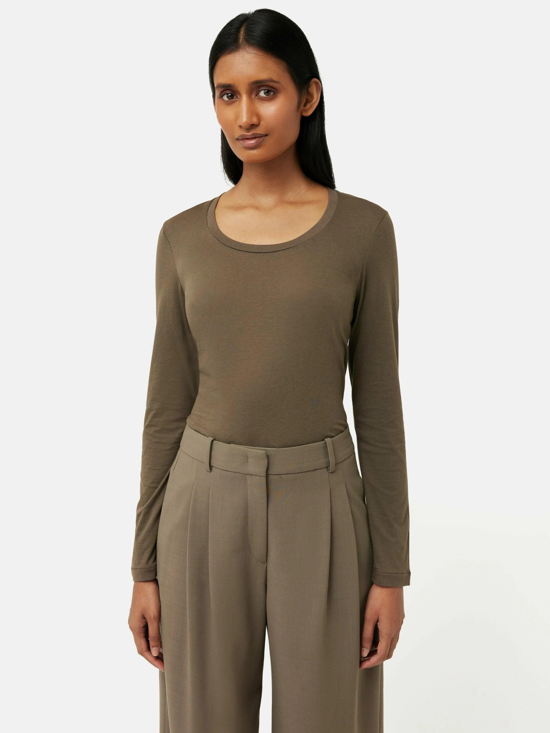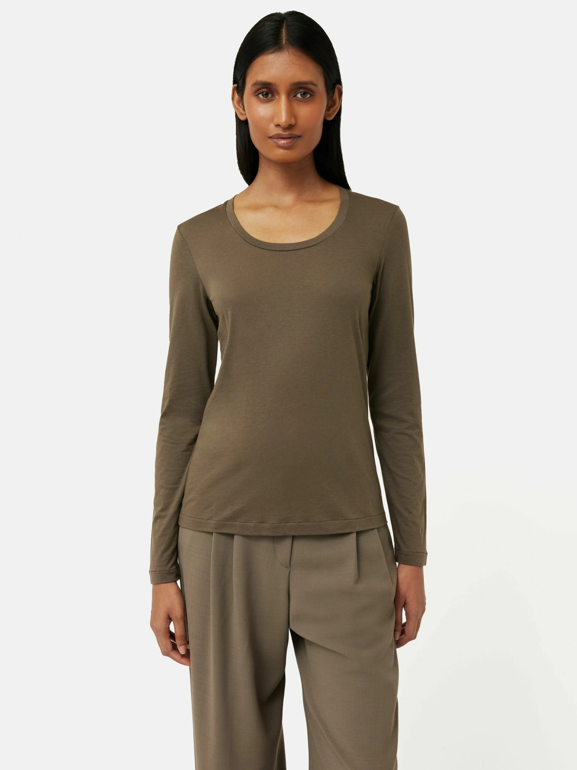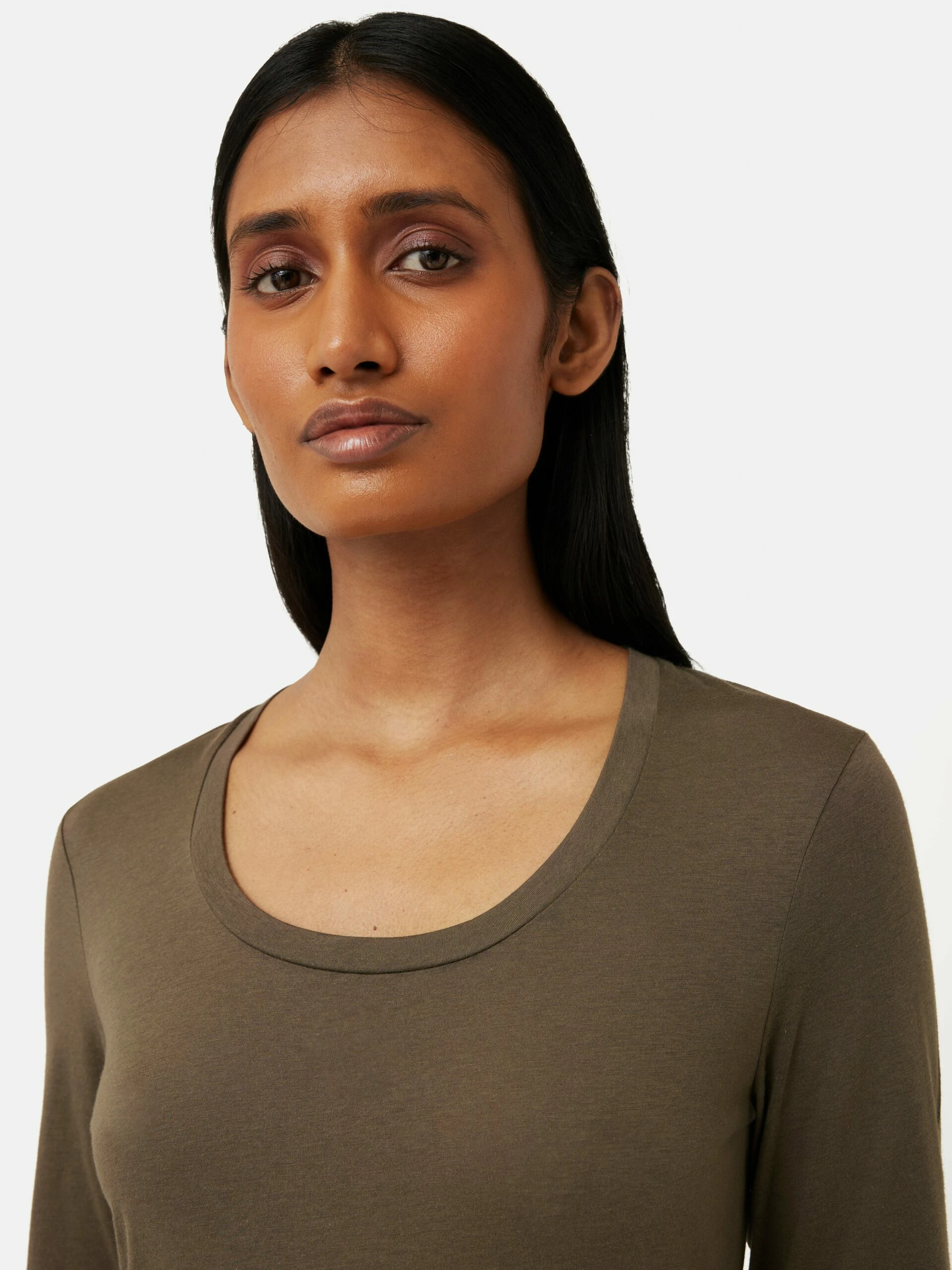 Made in Portugal, a soft cotton modal long sleeve t-shirt with a scoop neckline. A versatile tee, ideal for layering under a vest or this seasons tailoring.
