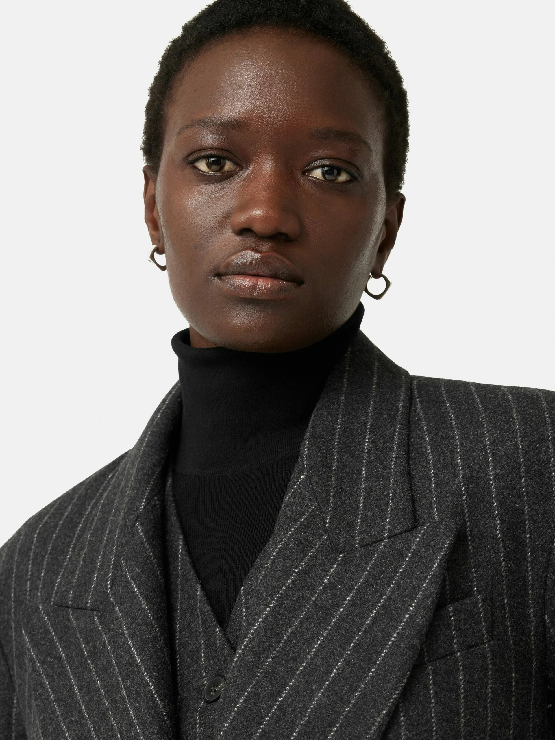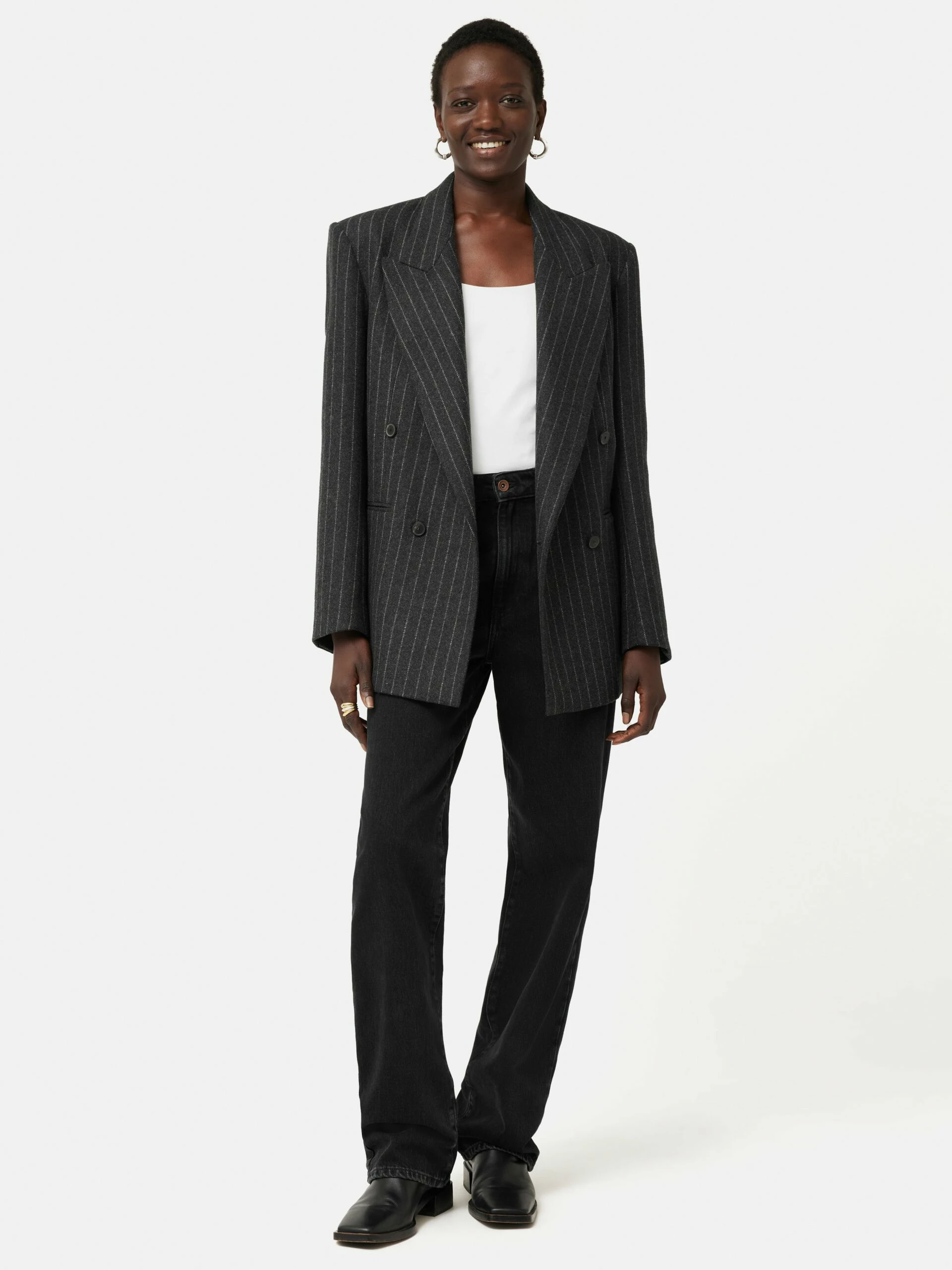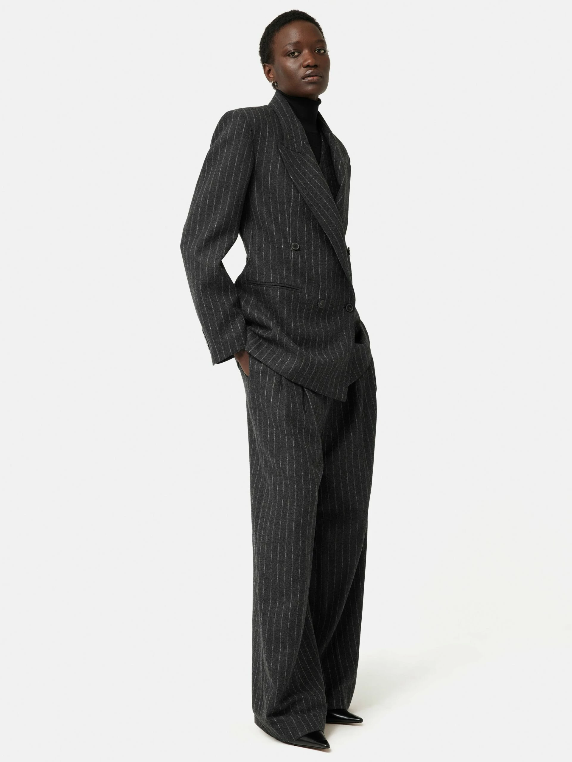 Introducing the Tatton, our new season tailoring shape. Patterned in-house for the perfect fit, this double-breasted blazer has a directional silhouette and structure through the shoulder. Crafted in a charcoal pinstripe wool-blend fabric from Italian heritage mill, Mantecco. Fully lined, featuring a melton undercollar, internal piping, front flap pockets and a single back vent. Arrives oversized so size down for a more fitted silhouette. Matching trousers and waistcoat complete this three-piece powerhouse suit or pare it back over jeans and a cotton shirt.