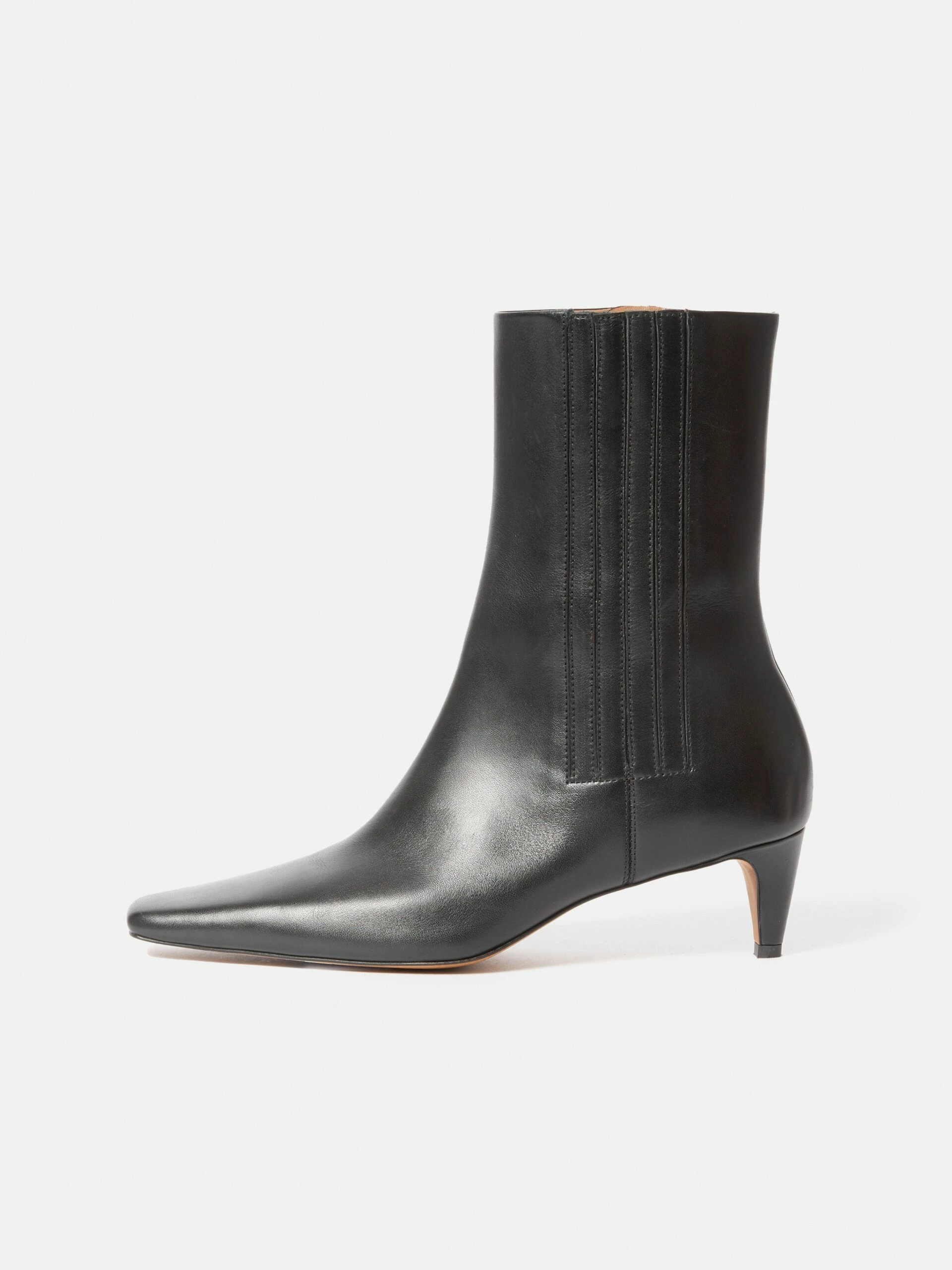 The Valerie Heeled Ankle Boot arriving in classic black supple leather with a chiselled toe.