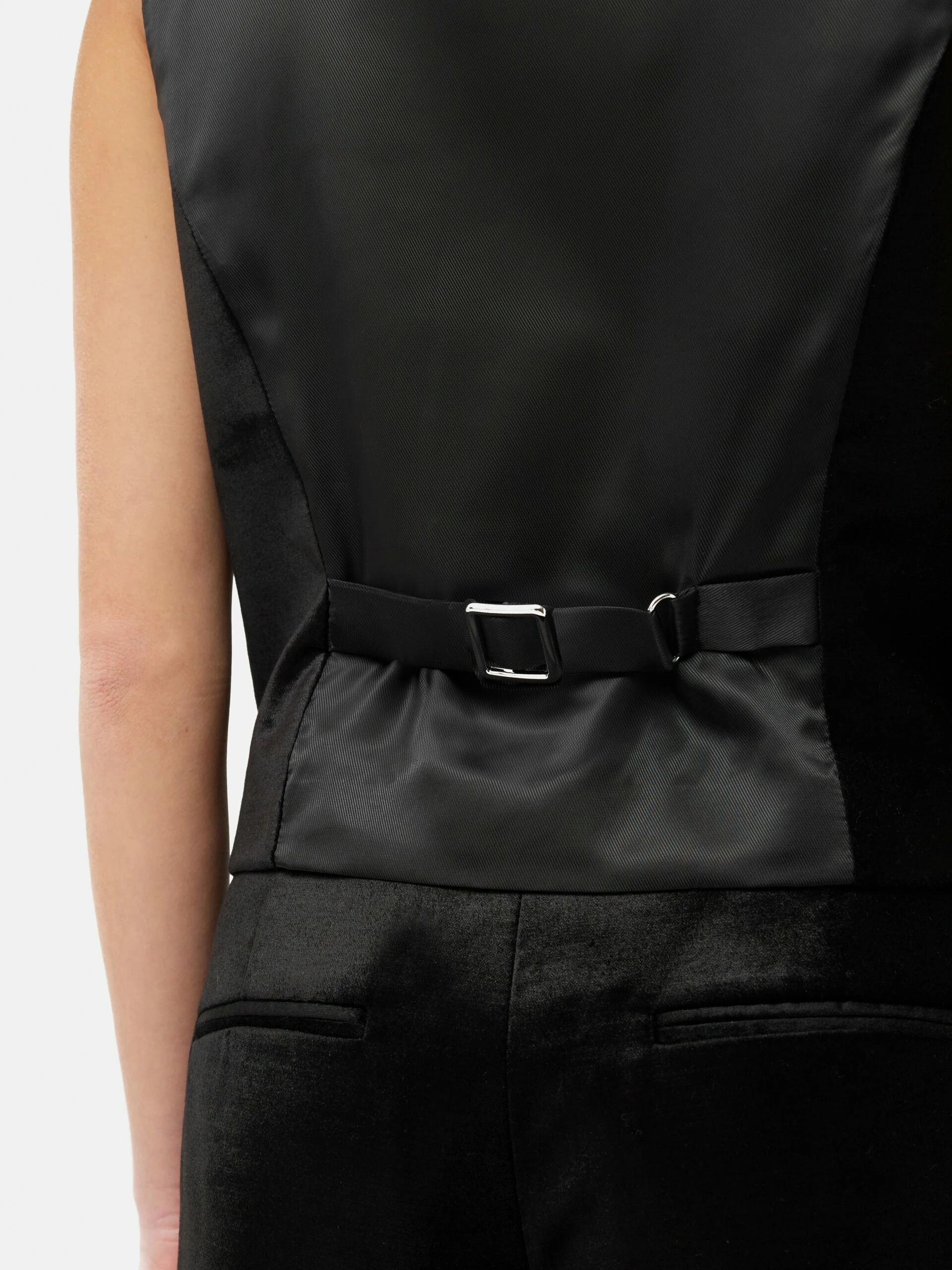 Tailored waistcoat cut from lustrous velvet with a contrast back panel. Fully lined, with a horn button front fastening and back waist buckle so you can adjust the silhouette. Arrives with matching blazer and trousers, this velvet set makes stand-out occasion wear.
