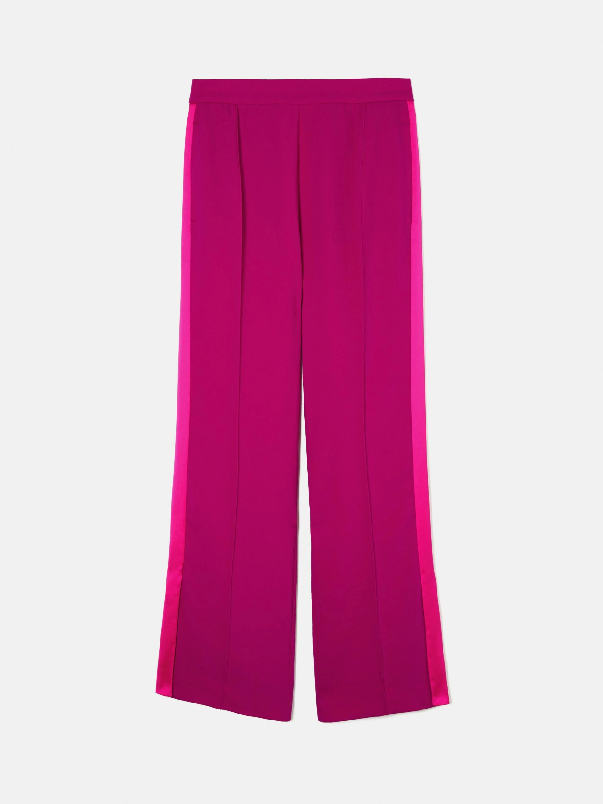 Stylish lounge trouser in soft textured crepe with contrast satin trim detail. Designed with a flat front and elastic back waistband for a more relaxed fit. Features a pin tuck crease down the front and a split hem detail. Matching blazer available. Ideal for occasion dressing.